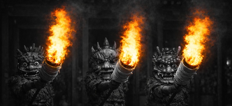 最初に現れるのは斧を持った赤鬼。続いて青鬼、茶鬼が登場し、三本のたいまつが並ぶと、堂内は炎に包まれ、祭りは最高潮を迎えます。