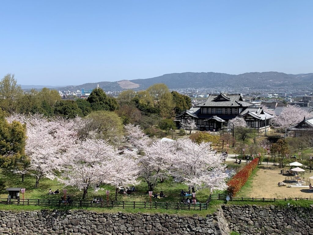 追手門(梅林門)や追手向櫓、追手東隅櫓、多聞櫓などの復元建造物、さらに内堀や曲輪(本丸・二之丸・毘沙門曲輪など)の跡も、往時の防備の様子を伝えています。