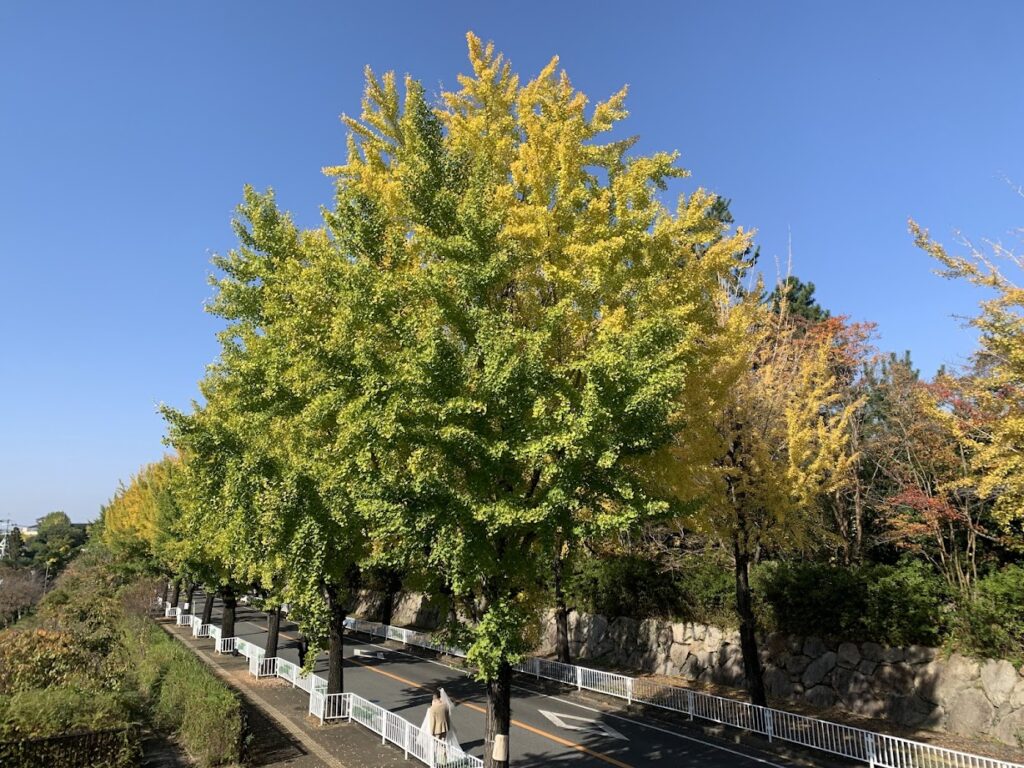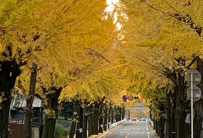 天理市役所の東の「親里大路(おやさとおおじ)」には、約100本のイチョウが並び、晩秋には歩道から黄金色に染まるトンネルが楽しめます。