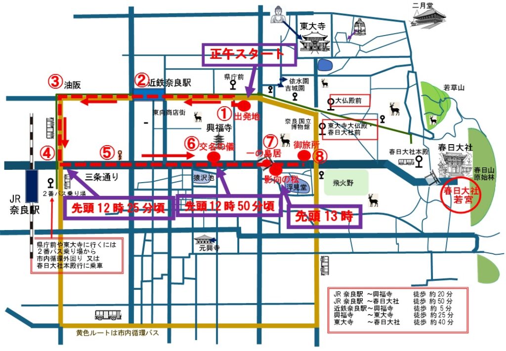 ①奈良県庁前 → ②近鉄奈良駅前 → ③油阪 → ④JR奈良駅前 → ⑤三条通 → ⑥興福寺南大門跡(交名の儀) → ⑦一の鳥居(松の下式) → ⑧御旅所