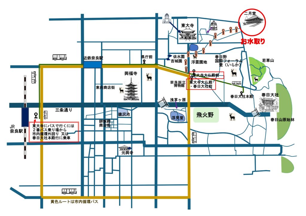 東大寺二月堂までJR奈良駅から徒歩で行く場合は、約3km、45分です。