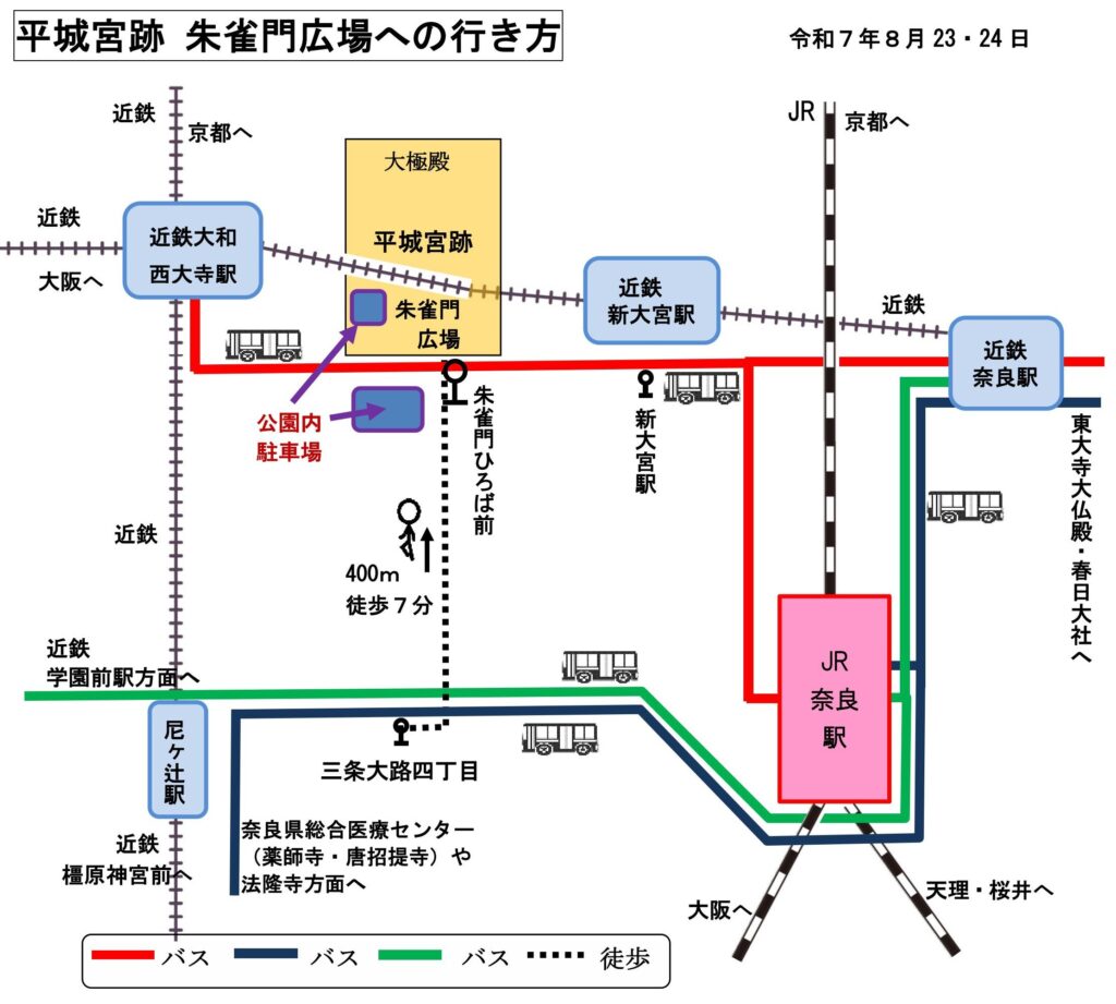または奈良交通「朱雀門ひろば前」バス停下車すぐ。 - 駐車場:あり(混雑が予想されるため、公共交通機関の利用がおすすめ)