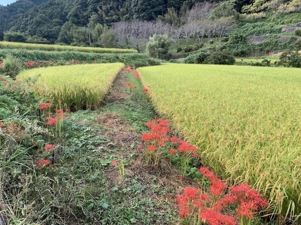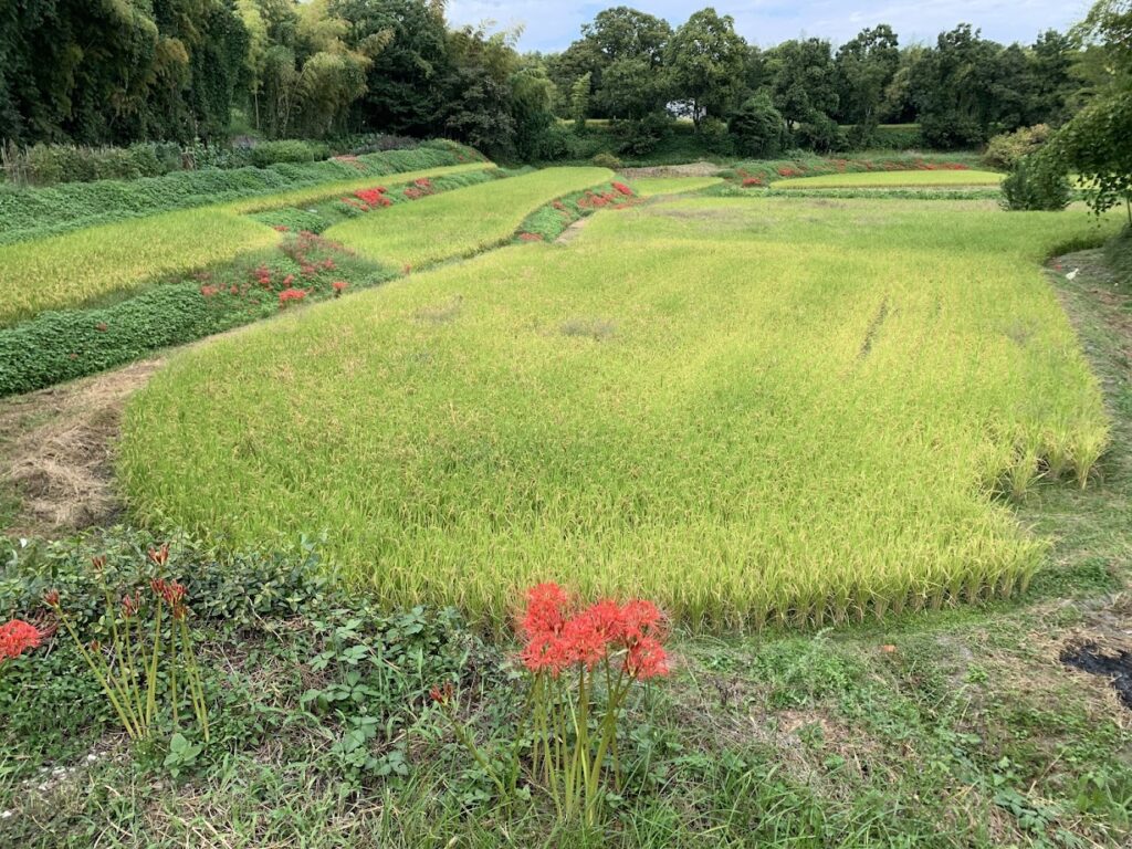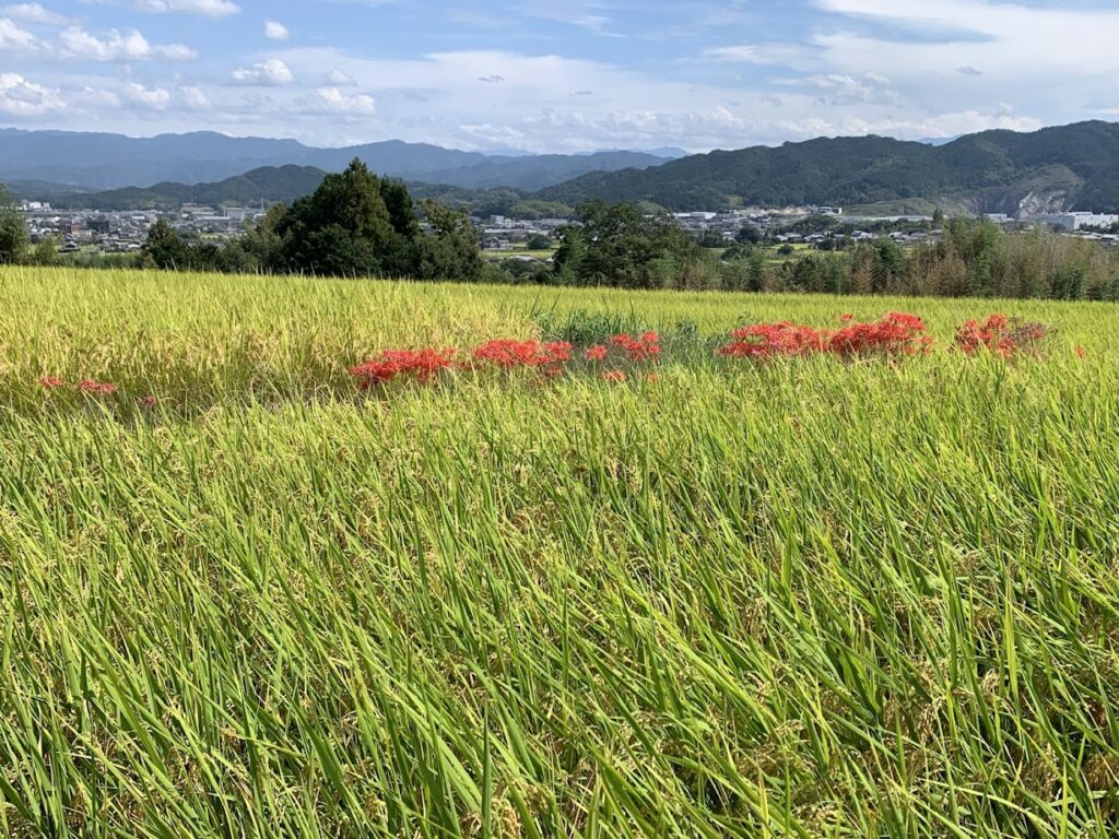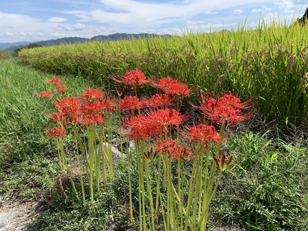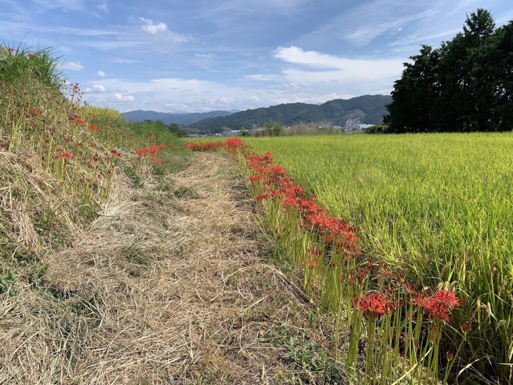 葛城山から金剛山のふもとに広がる田園風景の中、あぜ道や畔を真っ赤に染める彼岸花が続き、訪れる人を迎えてくれます。