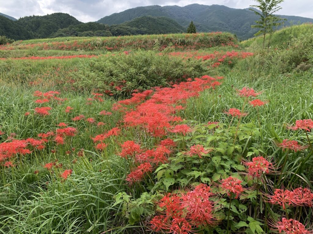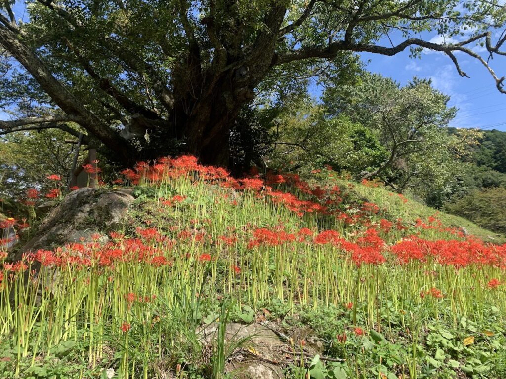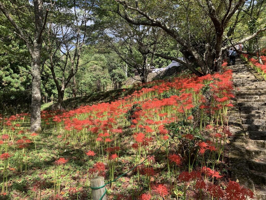 神社の参道周辺から古道にかけては、特に美しく彼岸花が咲き連なり、散策やハイキングを楽しむ人々に人気です。