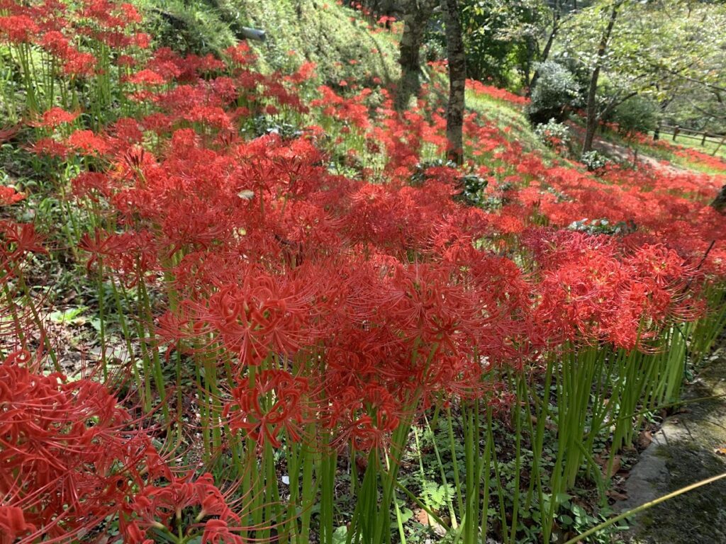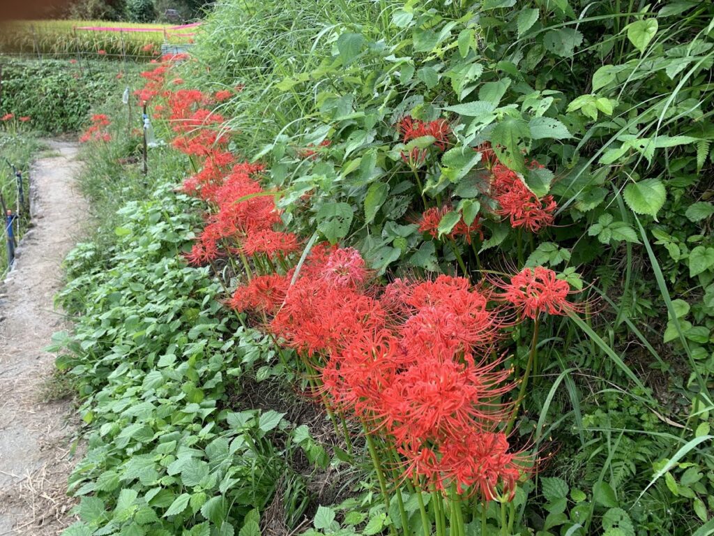 彼岸花は全体として見ごろに向かっており、場所によっては満開に近い箇所もあります。一方で、場所によってはまだつぼみの株も見られました。