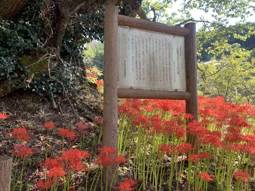 奈良県で最大かつ最古とされる桜の巨木と彼岸花で有名です。