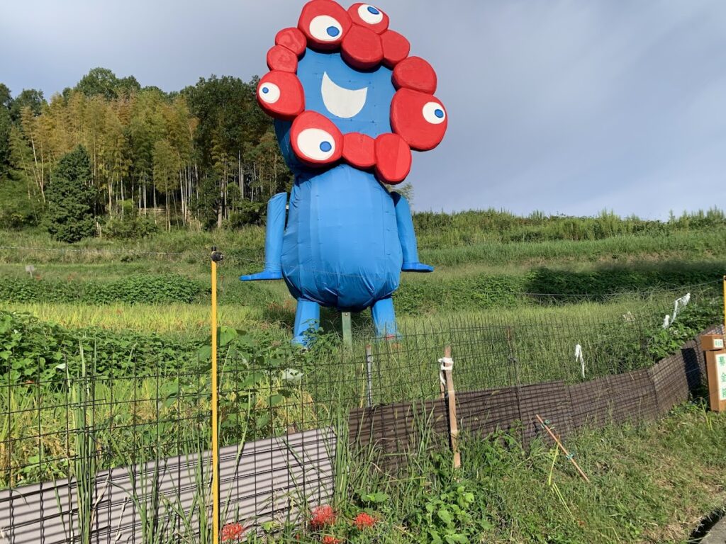 2025ジャンボ案山子は、万博の公式キャラクターの「ミャクミャク」です。