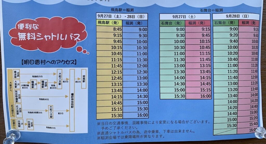 イベント期間中は臨時無料シャトルバス(近鉄飛鳥駅と石舞台から発車)や近隣の有料駐車場(例:石舞台古墳駐車場)をご利用ください。