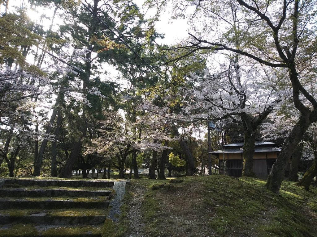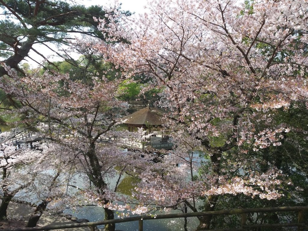 桜の間からのぞむ浮見堂