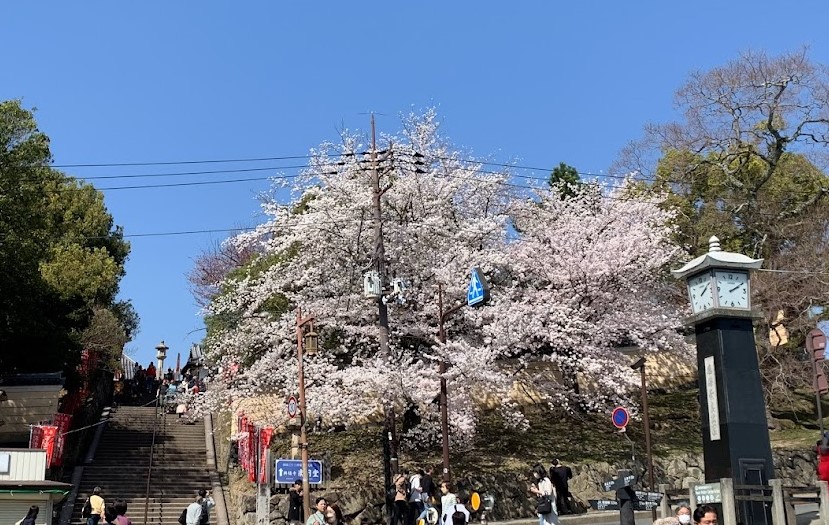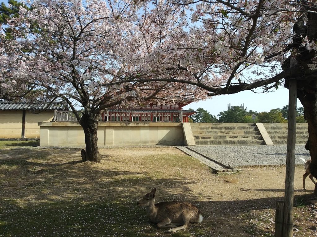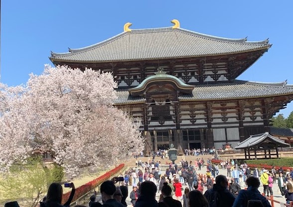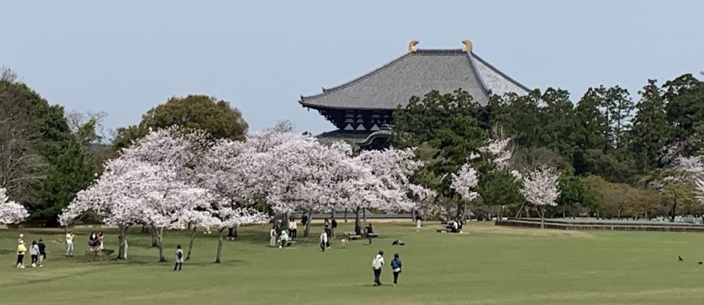 満開の桜と東大寺南大門や大仏殿がのぞめます。