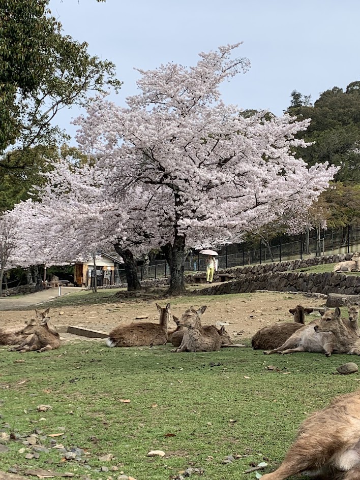 若草山のふもとで、多くの鹿が桜の下で休んでいます