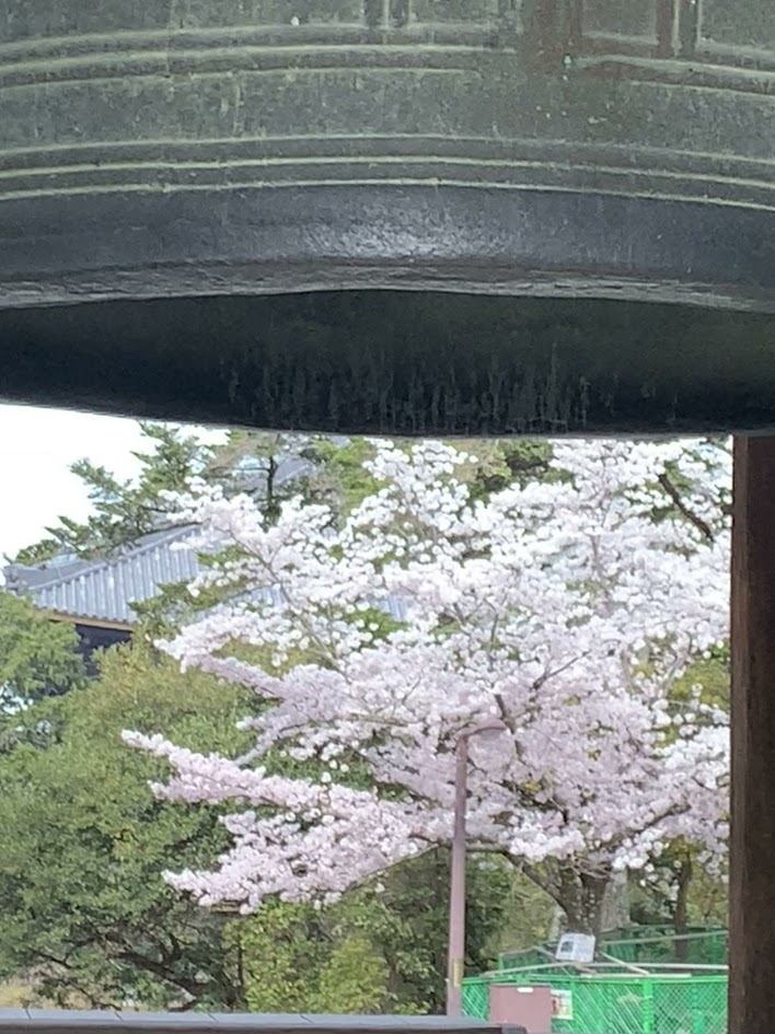 国宝の大釣鐘の向こうに満開の桜が見えます。