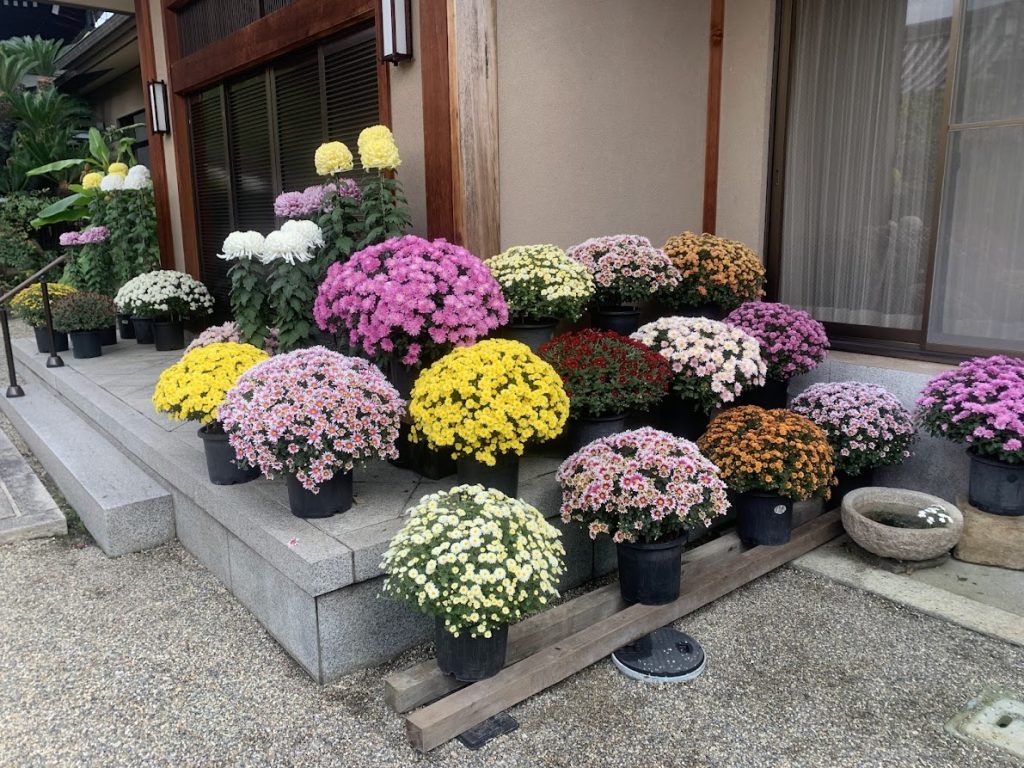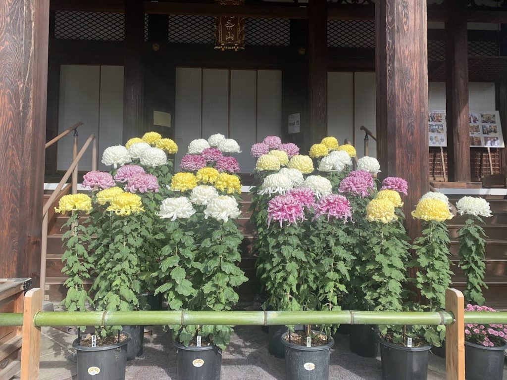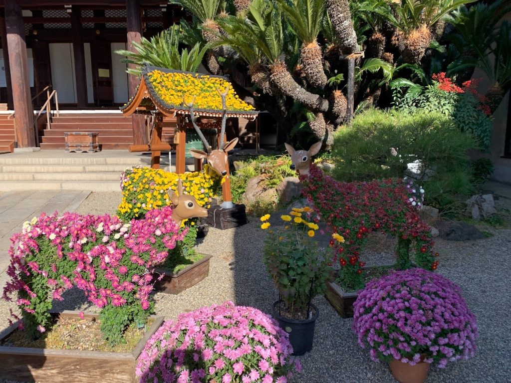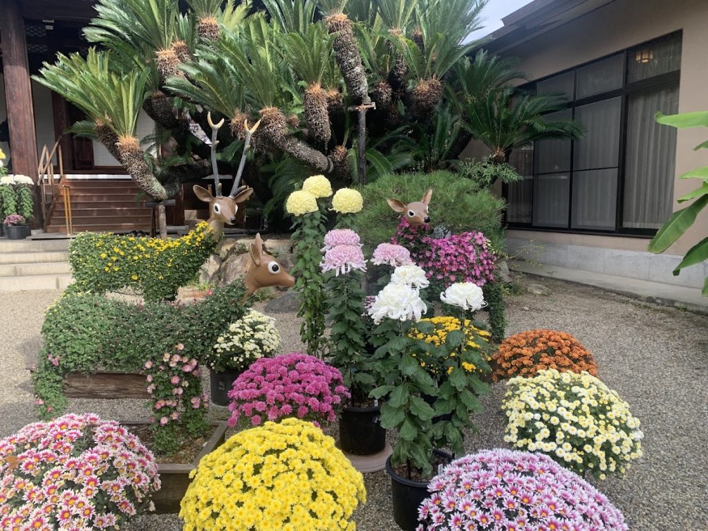 菊の季節、菊で手水舎や動物たちがきれいに飾られていました。