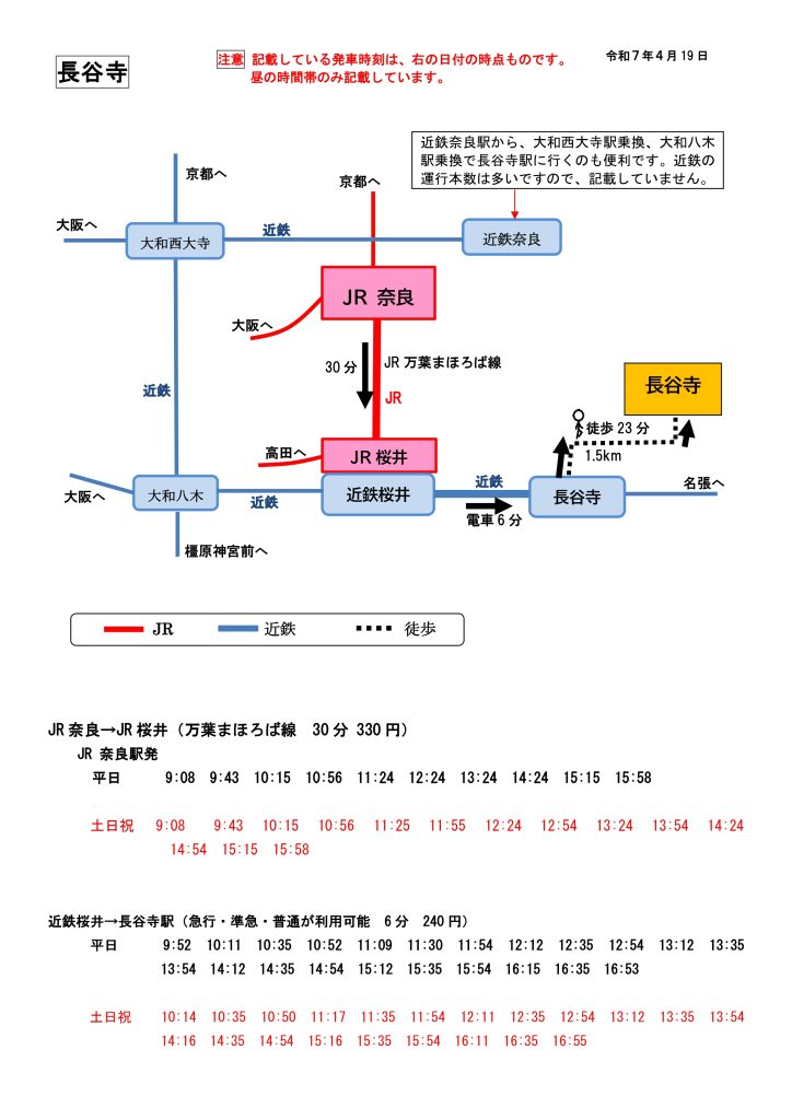 長谷寺へのJR・近鉄奈良駅からのアクセス|電車の乗り換え案内 行き方(奈良駅から) 2025.09.09 長谷寺のページに戻る 注意下の文書に記載している発車時刻は、文書右上の日付の時点のものです。当日の発車時刻はぜひ、ご自分で確認ください。特に、便数の少ない交通機関は、十分にご注意ください。なお、発車時刻は昼の時間帯のみ記載しています。