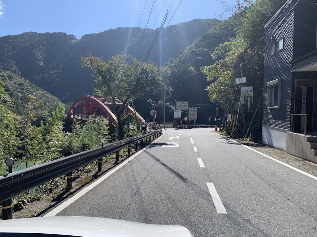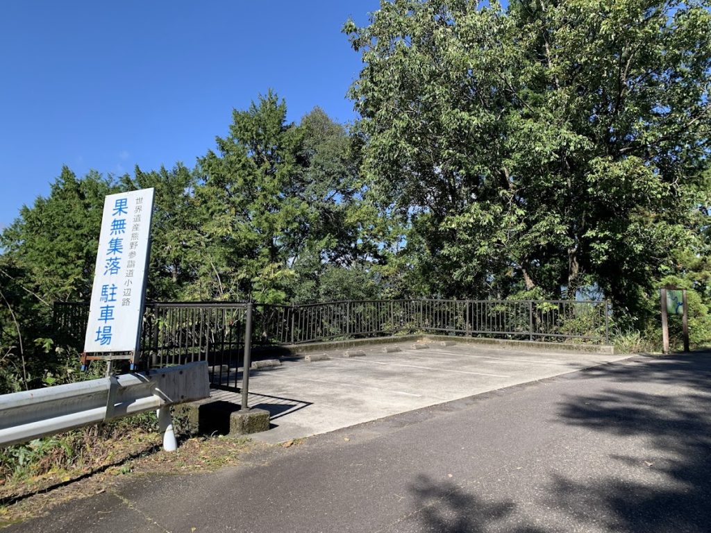十津川温泉から熊野本宮に向かって(南の方に)走ると赤い橋が見えてきます。この橋を渡ったところを右折し、数十メートル進むと、車3~4台ぐらいを停めることのできる駐車場があります。