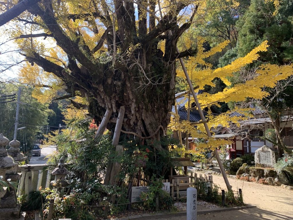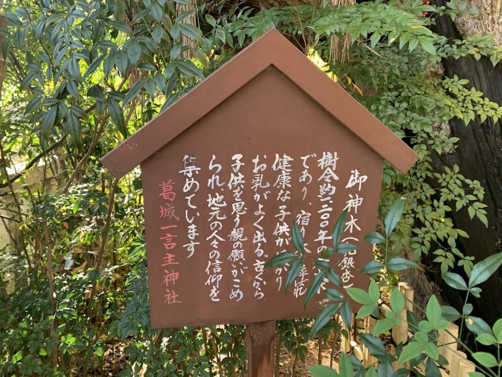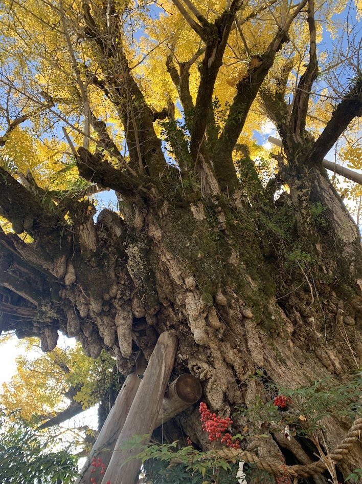 幹の途中から乳房のようなものがたくさん出ており、「乳イチョウ」と呼ばれています。この木に祈願すると、子どもを授かり、お乳がよく出ると言われています。