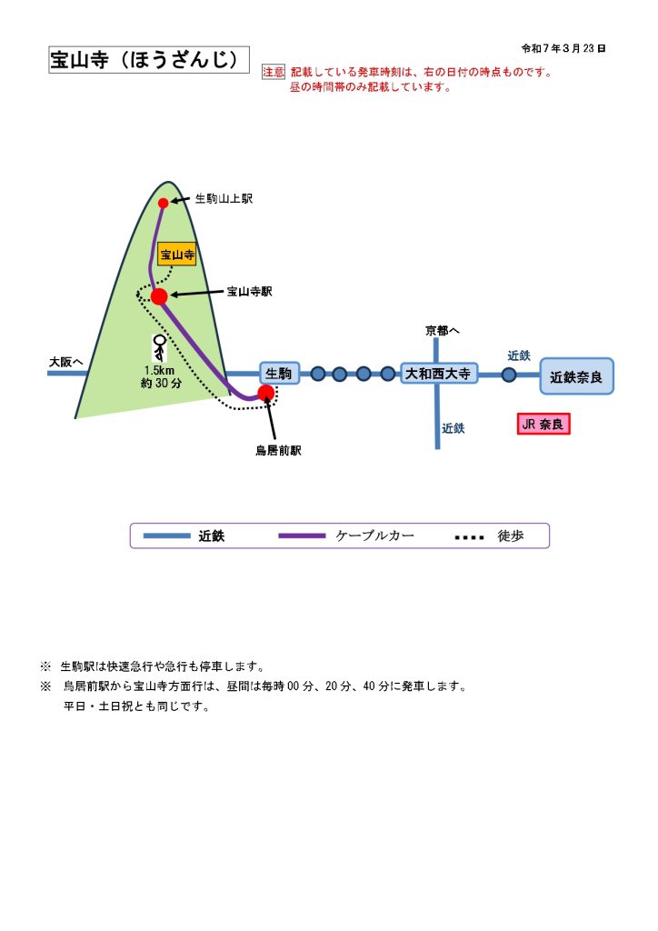 宝山寺へのアクセス|近鉄生駒駅からケーブルカーまたは徒歩 行き方(奈良駅から) 2025.09.09 宝山寺のページに戻る 注意下の文書に記載している発車時刻は、文書右上の日付の時点のものです。当日の発車時刻はぜひ、ご自分で確認ください。特に、便数の少ない交通機関は、十分にご注意ください。なお、発車時刻は昼の時間帯のみ記載しています。