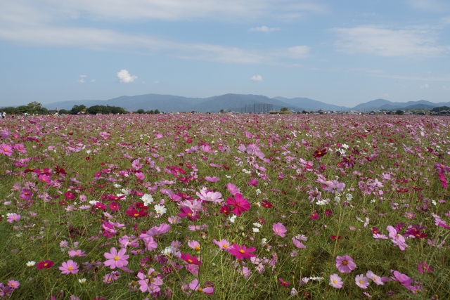 日本最初の都城・藤原京跡に広がる広大な花畑。秋には約240万本(4種類)ものコスモスが植えられ、橿原の山々を背景に広がるスケール感は圧巻です。区画ごとに色や種類を変えて植えられているため、場所によって違った風景を楽しめます。