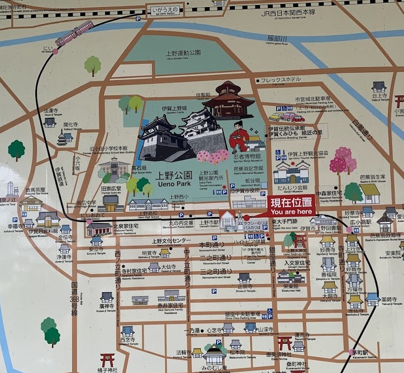 In the middle is Ueno-shi Station on the Iga Railway. Ueno Park, where the castle and Ninja Museum are located, is nearby.