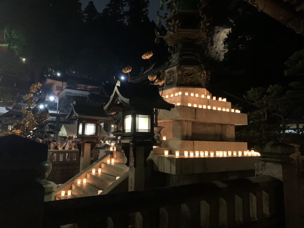 行灯(あんどん)とろうそくの灯り:参道や境内には、約1,000基の行灯と合わせて、最大1万本ものろうそくが灯され、幻想的な空間を演出します。