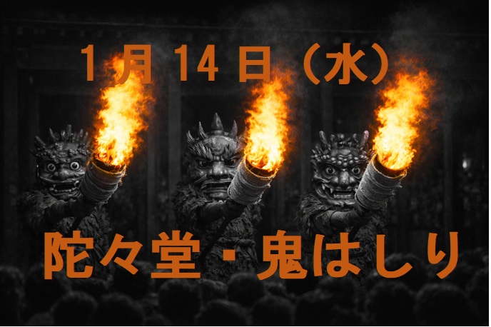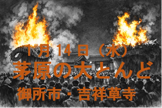 過去に紹介した祭りやイベントをまとめたページ|2026年1月14日まで 奈良の祭りや行事 2026.01.15 これまでに、この「魅力いっぱい奈良」で紹介してきた祭りやイベントをまとめました。 【8月30・31日】 奈良「バサラ祭り」 【1月14日(水)】茅原の大とんど|県内最大のとんど|御所市の吉祥草寺2026 【1月14日(水)】陀々堂(だだ堂)の鬼はしり|イベント|五條市2026 【1月4日】大和神社のお弓始め祭|新年の弓打ち神事(天理市)2026 大神神社の繞道祭(にょうどうさい)|元日未明の「ご神火まつり」|2026正月 年末年始の長谷寺|観音万燈会と新春大観音特別拝観で迎えるお正月2026 | 魅力いっぱい 奈良 年末年始の東大寺|除夜の鐘・元日早朝の大仏殿無料拝観・二月堂の行事2026お正月 【12月22日(月)】一言主神社「一陽来復祭」|冬至のイベント紹介 【12月21日(日)】大神神社「冬至の福南瓜煮」|冬至前日のイベントやアクセス紹介 【12月17日(水)】春日若宮おん祭のお渡り式2025|見どころやルート解説 晩秋の奈良公園|紅葉のおすすめ観光地を地図と写真で紹介 【11月29・30日】ほこてんり2025|イチョウ並木が歩行者天国に!|ライトアップやパレードも開催 紅葉スポット25選|見ごろ時期やアクセス・駐車場を詳しく説明2025 【11月中旬~】正暦寺の紅葉2025|もみじの絶景|アクセスも紹介 ススキの絶景・曽爾高原|山灯りライトアップは11/24まで|バス情報や駐車場紹介 【10月19日~11月30日】秋のバラまつり|おふさ観音2025|駐車場紹介 【11月23日】たかとり城まつり2025|日程やアクセス・駐車場紹介 【11月】関西文化の日|奈良県の無料になる24施設2025 【11月16日】行基さん大感謝祭2025|いただきます|奈良公園飛火野にて 【11月15日】王寺ミルキーウェイ2025|花火も|アクセスや見どころ 【10月】奈良県の伝統行事やイベント総まとめ|わかりやすく説明 奈良・10月の花々|見どころ一挙紹介|コスモス、ダリア、秋バラ、ソバ 【10月14日】藤原宮跡のコスモス|開花状況と駐車場2025 【10月11日】法起寺と馬見丘陵公園のコスモスの開花状況と駐車場2025 【10月25日~11月10日】正倉院展|奈良国立博物館|蘭奢待も見どころ 【11月7~9日】東の滝・夢淵ライトアップ|東吉野村のイベント | 魅力いっぱい 奈良 【11月8日・9日】鹿の角きり|春日大社境内の鹿苑|奈良の秋の伝統行事 【11月8・9日】天の川もみじまつり2025|天川村の紅葉イベント紹介 【11月8・9日】なら奈良まつり2025|平城宮跡朱雀門ひろば|花火や盆踊りも 【10月28日】法起寺のコスモスの開花状況と駐車場2025 【10月28日】馬見丘陵公園のコスモス・ダリア開花状況と駐車場2025 【10月28日】藤原宮跡のコスモスの開花状況と駐車場2025 【11月3日】山添やんばい祭り2025|名阪山添ICすぐ|駐車場紹介 【11月3日】秋の平城京天平行列「東大寺参詣」2025|コースや見学時間紹介 【11月3日】大安寺国際縁日2025|イベント内容やアクセス・駐車場紹介 【11月3日】秋のけまり祭2025|談山神社の紅葉も見どころ 【11月3日】飛鳥・藤原歴史探訪スタンプラリー|イベントまとめ 【11月2日】大和さくらい万葉まつり|笑い飯や河内家菊水丸も登場|イベント詳細 【10月24日】秋の大神祭(おおみわさい)|詳細やアクセス・駐車場2025 【10月19日】うたの秋祭り|時間帯や駐車場のまとめ2025 | 魅力いっぱい 奈良 【10月18・19日】広陵かぐや姫まつり2025|イベントをわかりやすく紹介 【10月18・19日】かしはら藤原宮跡コスモスマルシェ2025|イベントをわかりやすく紹介 明日香と仏隆寺と葛城古道の彼岸花、笠のソバの開花状況2025【9月27・28日】 彼岸花|奈良のおすすめスポット|明日香・葛城古道・佛隆寺・元興寺 【10月15日】布留祭り(ふるまつり)のお渡り|石上神宮|イベントを写真とともに解説 【10月10日~13日】平城京 秋の散楽フェスタ2025|わかりやすくイベント紹介 【10月11・12日】生駒・往馬大社「火祭り」2025年|写真も紹介 【10月12日】題目立|八柱神社(奈良市上深川町)|ユネスコ無形文化遺産をわかりやすく紹介 【10月8日】奈良豆比古(ならづひこ)神社の翁舞|伝統的なイベント紹介 【10月6日】中秋の名月の観月会・お月見2025|奈良のイベントまとめ 【10月6日(月)】「采女祭」2025年|奈良・猿沢池の幻想的な夜 【10月6日】唐招提寺「観月讃仏会」2025|鑑真和上と名月を愛でる 【10月6日】大神神社「観月祭」2025|三輪山に浮かぶ中秋の名月 【10月6日】郡山城「観月会」2025年|イベント詳細|秀長も愛でたであろう名月を楽しむ 2025年の「中秋の名月」|10月6日(月)|采女祭り開催 10月6日は中秋の名月|奈良は饅頭発祥の地|名店紹介 【10月6日】京都の観月会6選|中秋の名月2025年 【10月4日(土)】けいはんな記念公園「観月の夕べ」2025|イベント情報 【10月4日・5日】奈良クラフトビール祭り2025|奈良公園で秋を満喫! 奈良の9月イベントまとめ2025|フードフェス・万灯会・水遊びまで一挙紹介 奈良・9月に見頃を迎える花々|見どころスポットを一挙紹介 稲渕棚田案山子まつり2025|かかしのイベント詳細【9月27日・28日】 生駒聖天 お彼岸万燈会(宝山寺)|イベント詳細|2025【9月23日(火・祝日)】 大和神社|