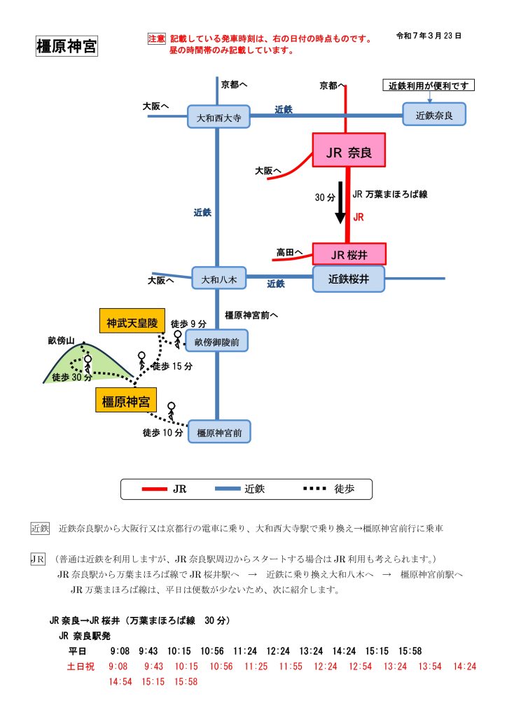 橿原神宮へのアクセス|近鉄橿原神宮前駅から徒歩10分 行き方(奈良駅から) 2025.09.09 スポンサーリンク 橿原神宮のページに戻る 注意下の文書に記載している発車時刻は、文書右上の日付の時点のものです。当日の発車時刻はぜひ、ご自分で確認ください。特に、便数の少ない交通機関は、十分にご注意ください。なお、発車時刻は昼の時間帯のみ記載しています。