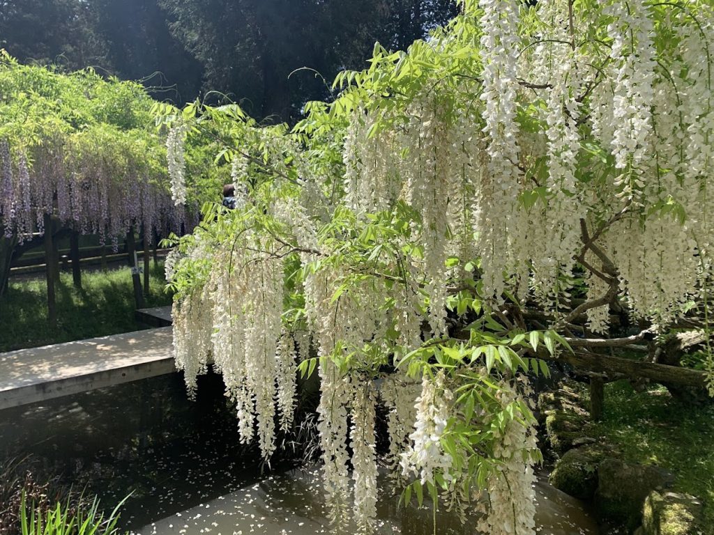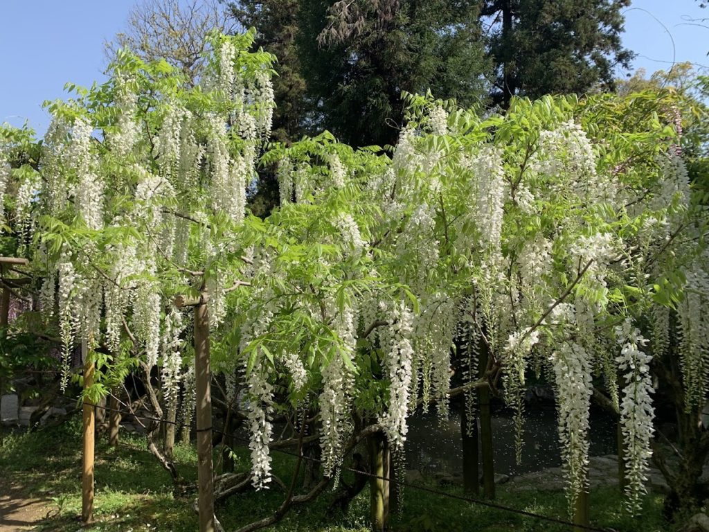 Located to the left of the worship hall, this wisteria is named for its blossoms, which are so long that they brush against the ground. It is said to be an ancient tree, with an estimated age of around 800 years.