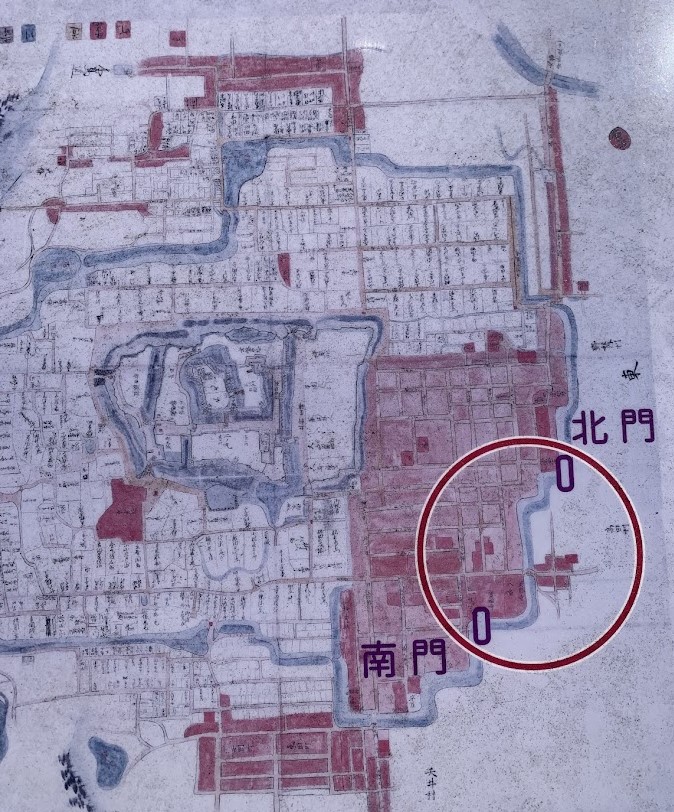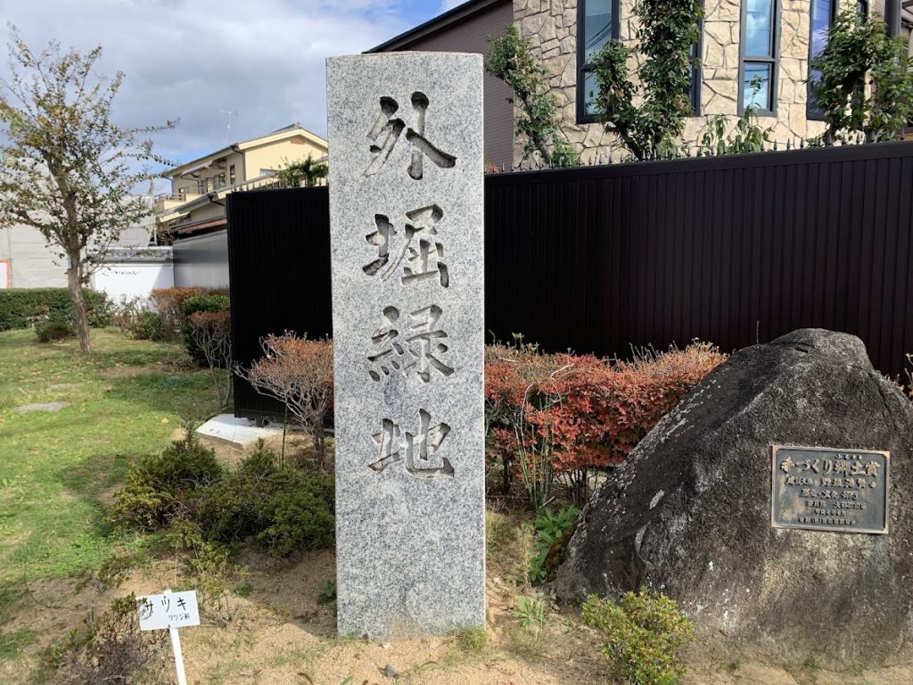 現在、丸で囲まれたところが「外堀緑地」として整備されています。