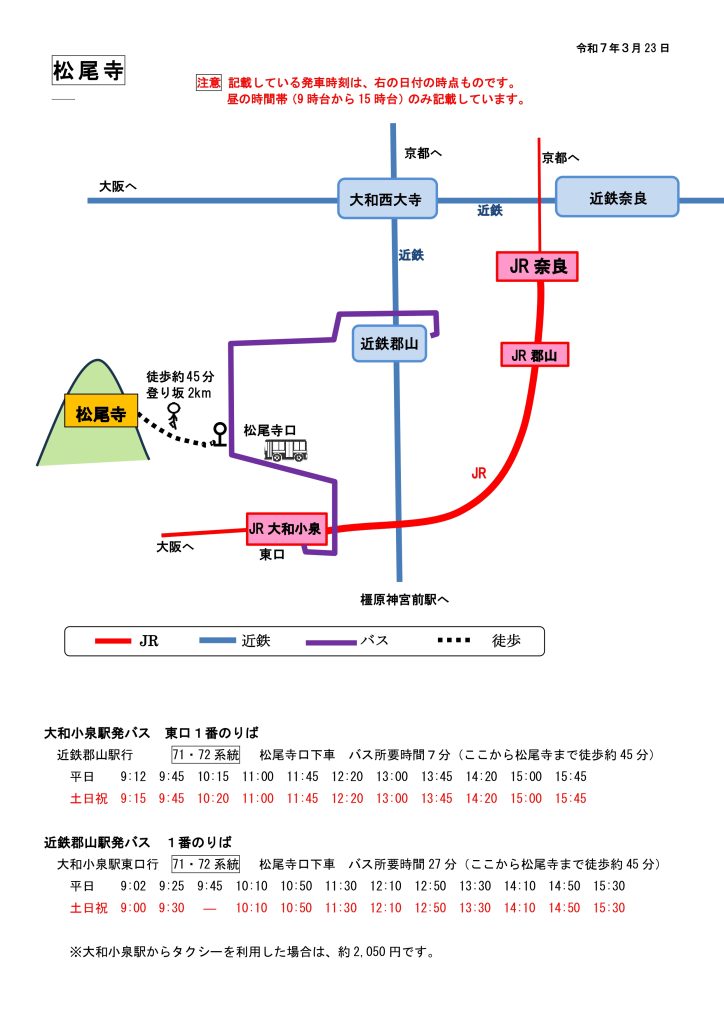 松尾寺へのアクセス|JR大和小泉駅または近鉄郡山駅からバスそして徒歩 行き方(奈良駅から)photo-of-long-steps-at-matsuo-dera 2025.09.09 松尾寺のページに戻る 注意下の文書に記載している発車時刻は、文書右上の日付の時点のものです。当日の発車時刻はぜひ、ご自分で確認ください。特に、便数の少ない交通機関は、十分にご注意ください。なお、発車時刻は昼の時間帯のみ記載しています。