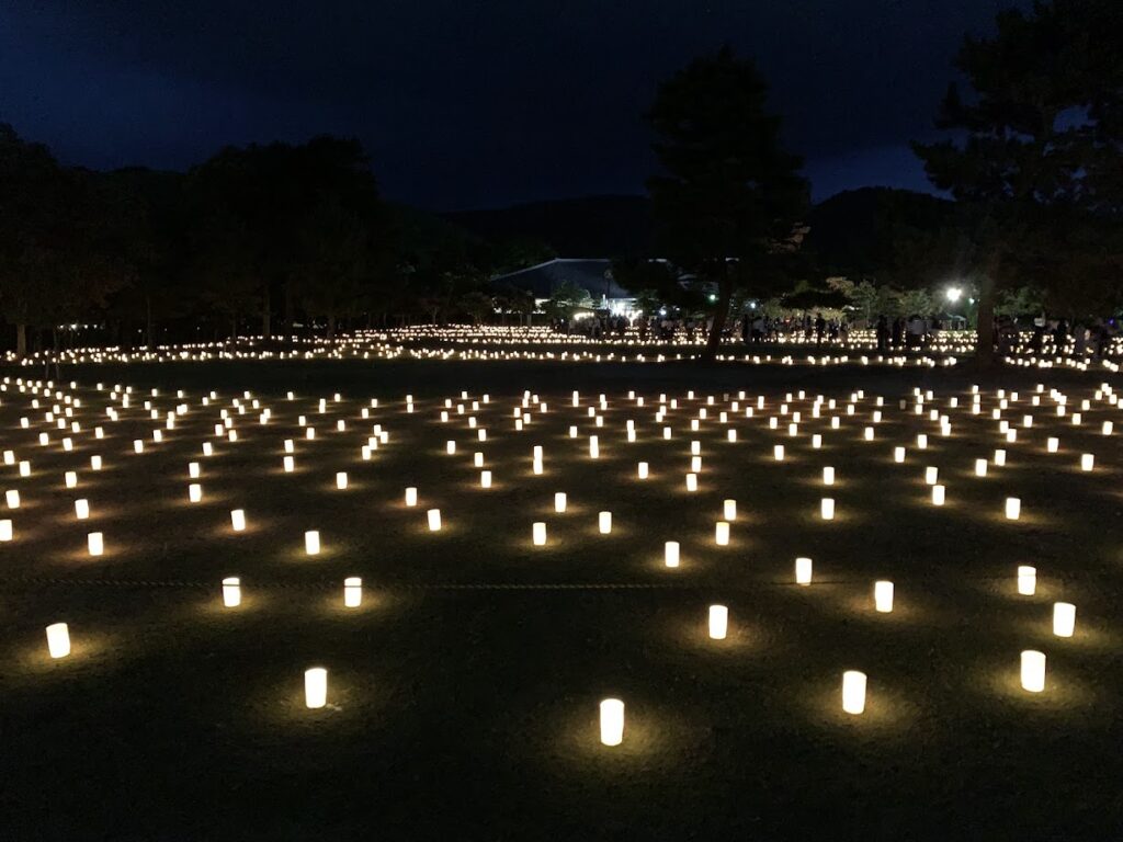 • 奈良公園の芝生広場に、最多数のろうそくが敷き詰められた「地上の天の川」。約5000〜6000本のろうそくが灯される圧巻の光景が広がります