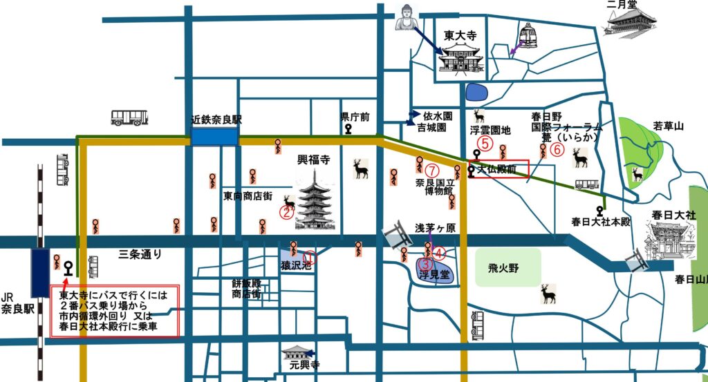 ※JR奈良駅からバスで県庁前(興福寺へ)又は大仏殿前(メイン会場浮雲園地へ)まで行くこともできます。