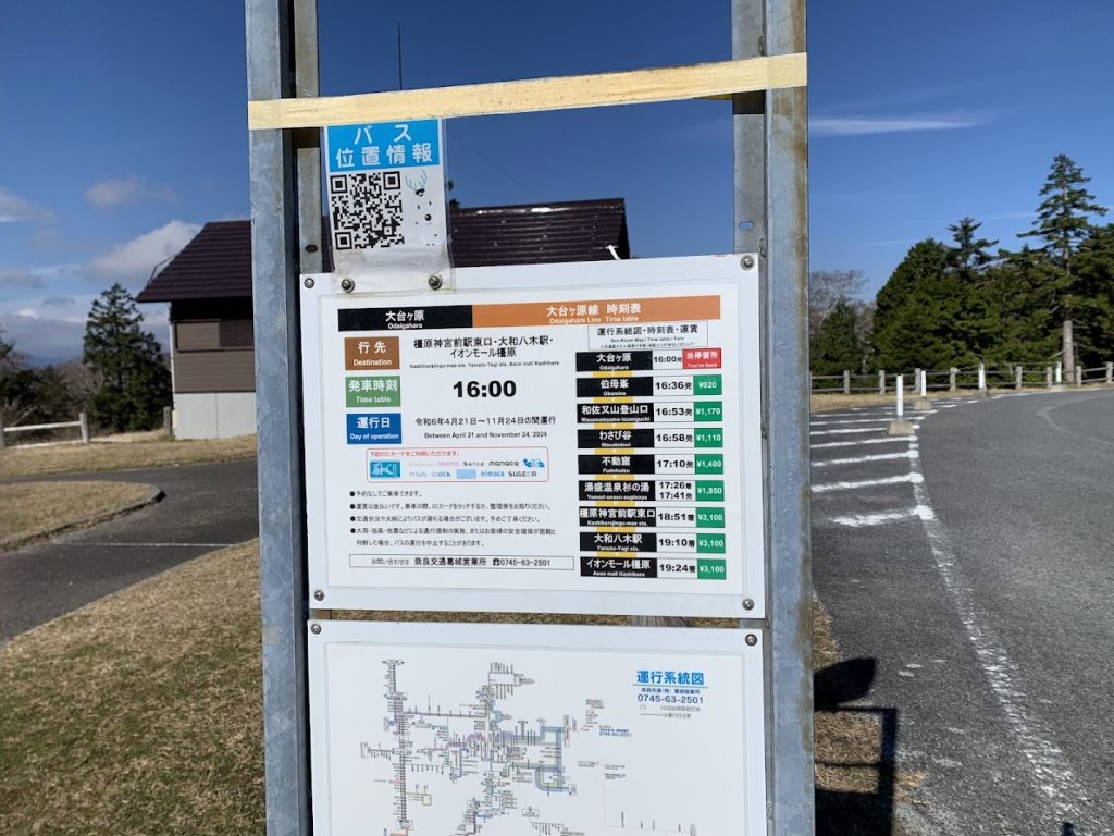 There is only one bus per day, departing at 4:00 PM, heading to Kintetsu Yamato-Yagi Station.