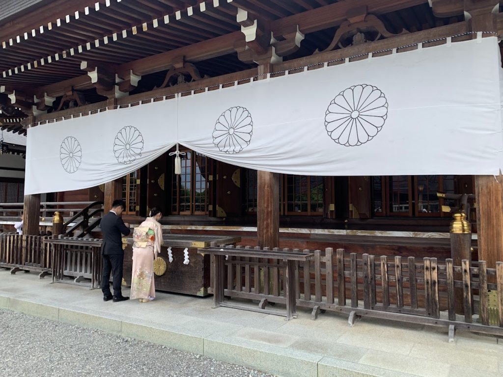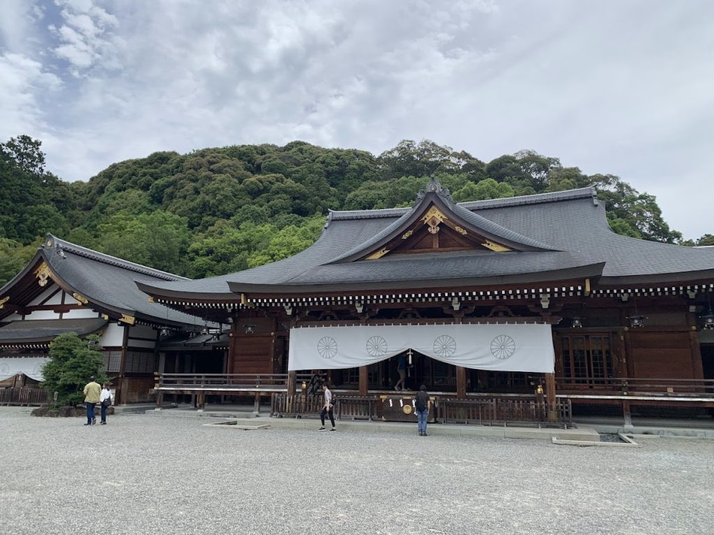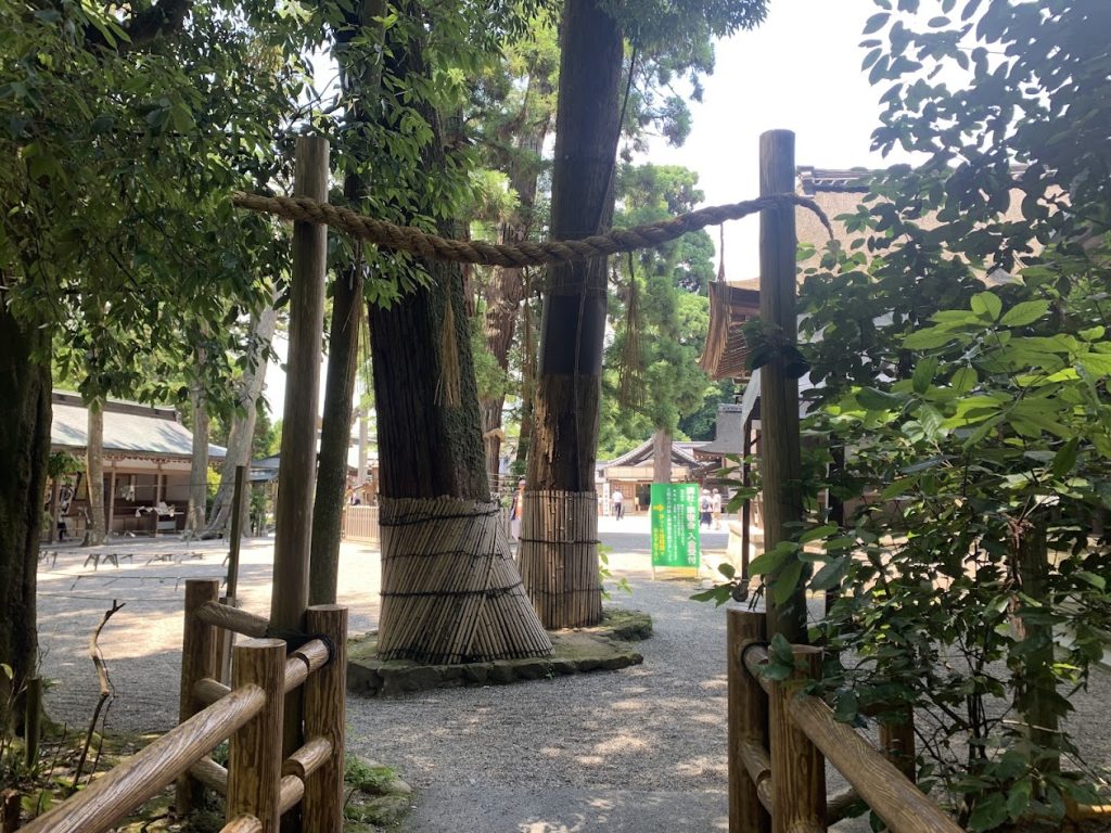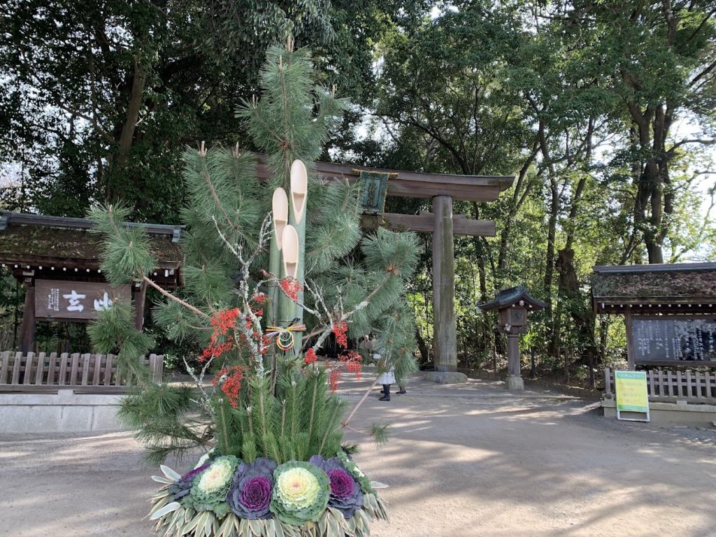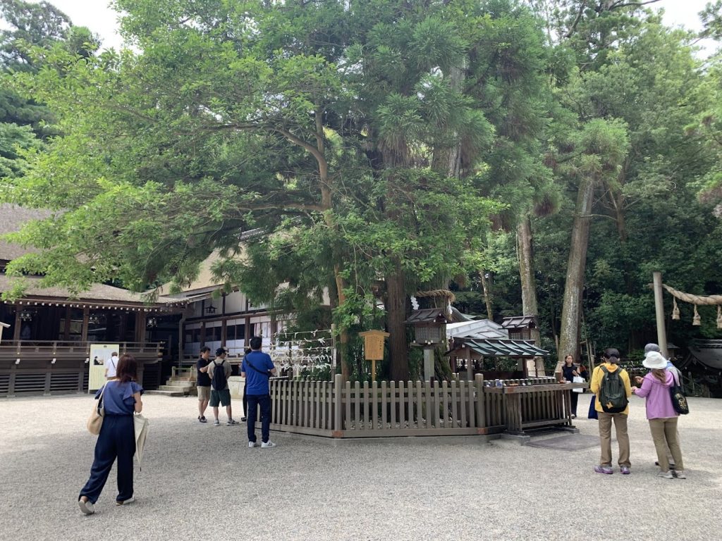 The sacred cedar tree can be seen on the right side of the photo. During the New Year’s visit (Hatsumode), many people come to offer their prayers.