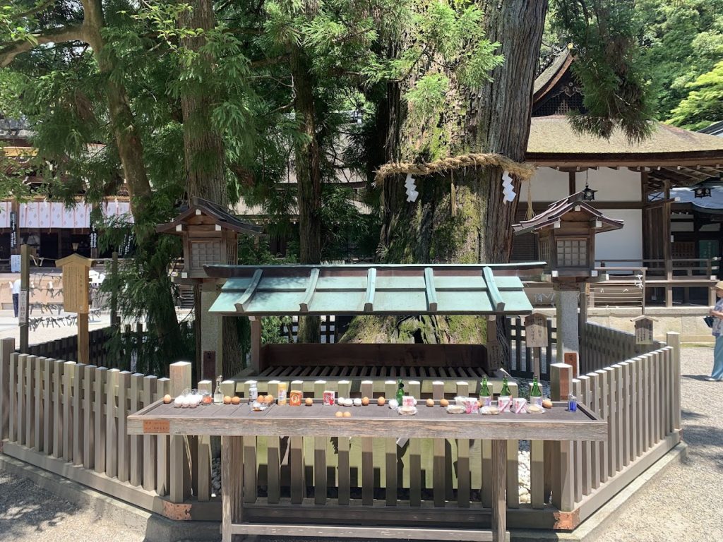 Eggs and sake are offered in front of the large tree because these are believed to be the preferred offerings of the snake deity, brought by worshippers.