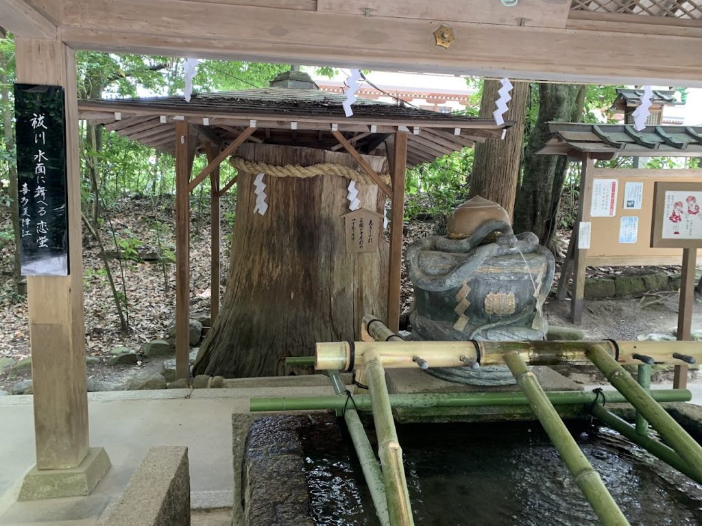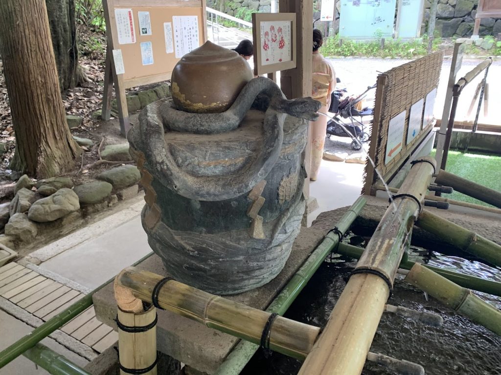At the chozu (purification fountain), many shrines have water flowing from the mouth of a dragon, but at Omiwa Shrine, it comes from a snake.