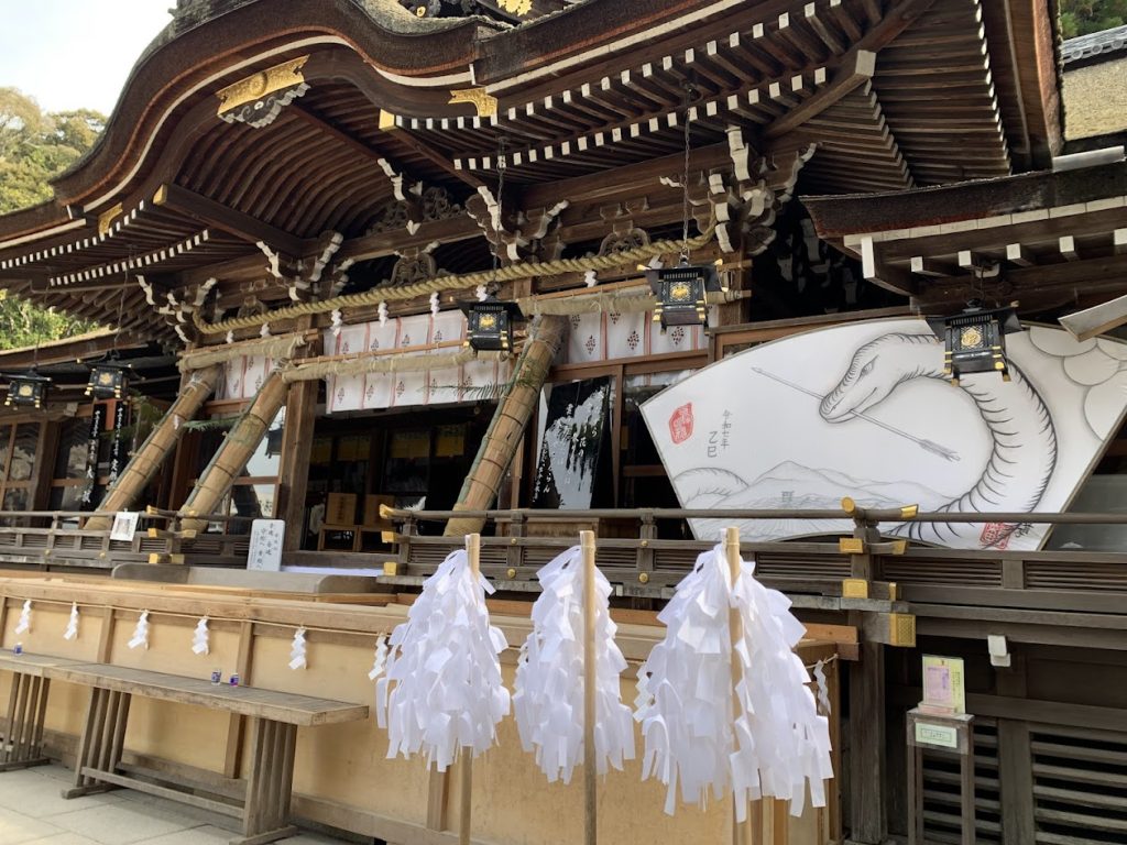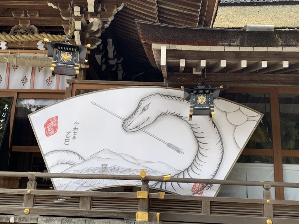The deity Omononushi no Okami, the main deity enshrined here, is said to have taken the form of a snake, as recorded in ancient texts like the Nihon Shoki. The snake deity is worshipped as an incarnation of Omononushi no Okami.