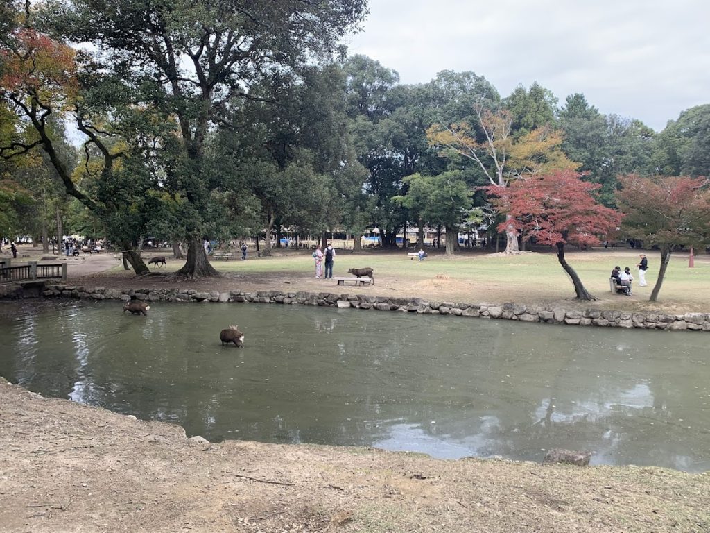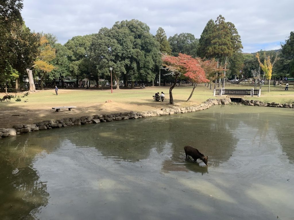 晩秋の奈良公園で、鹿たちが水浴びをしています。