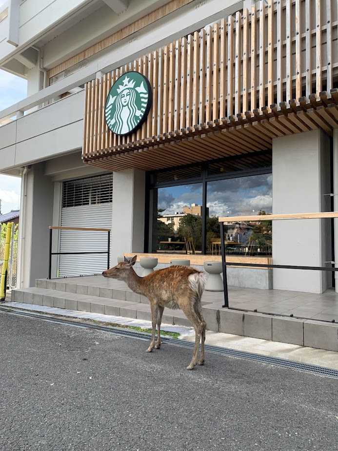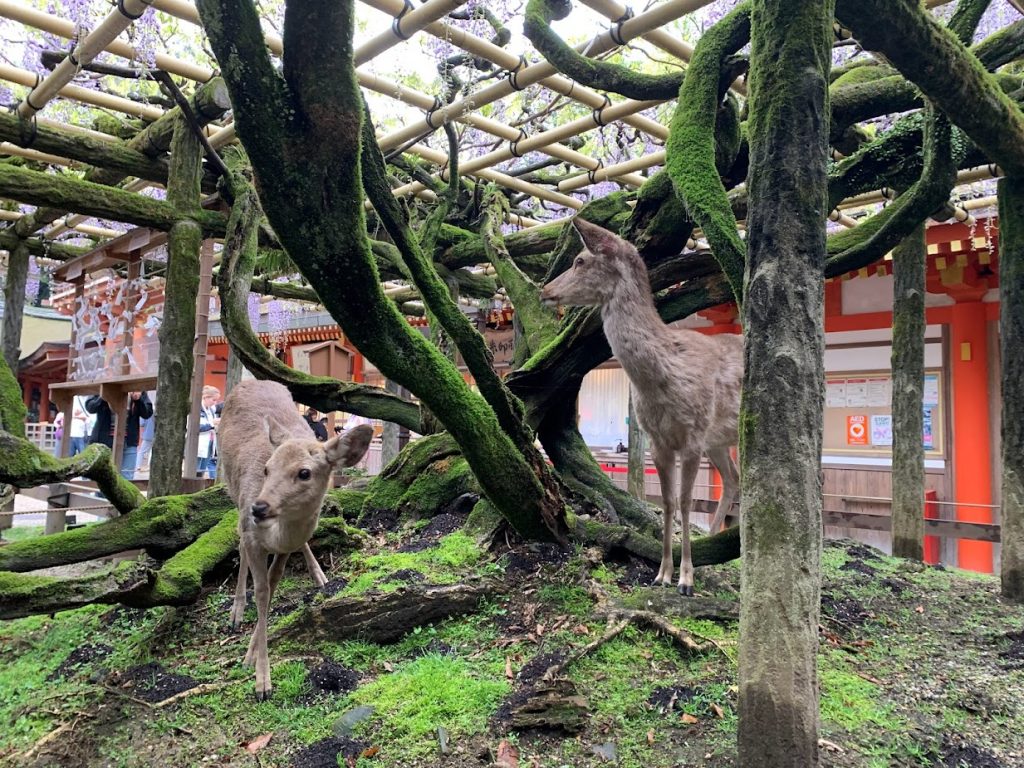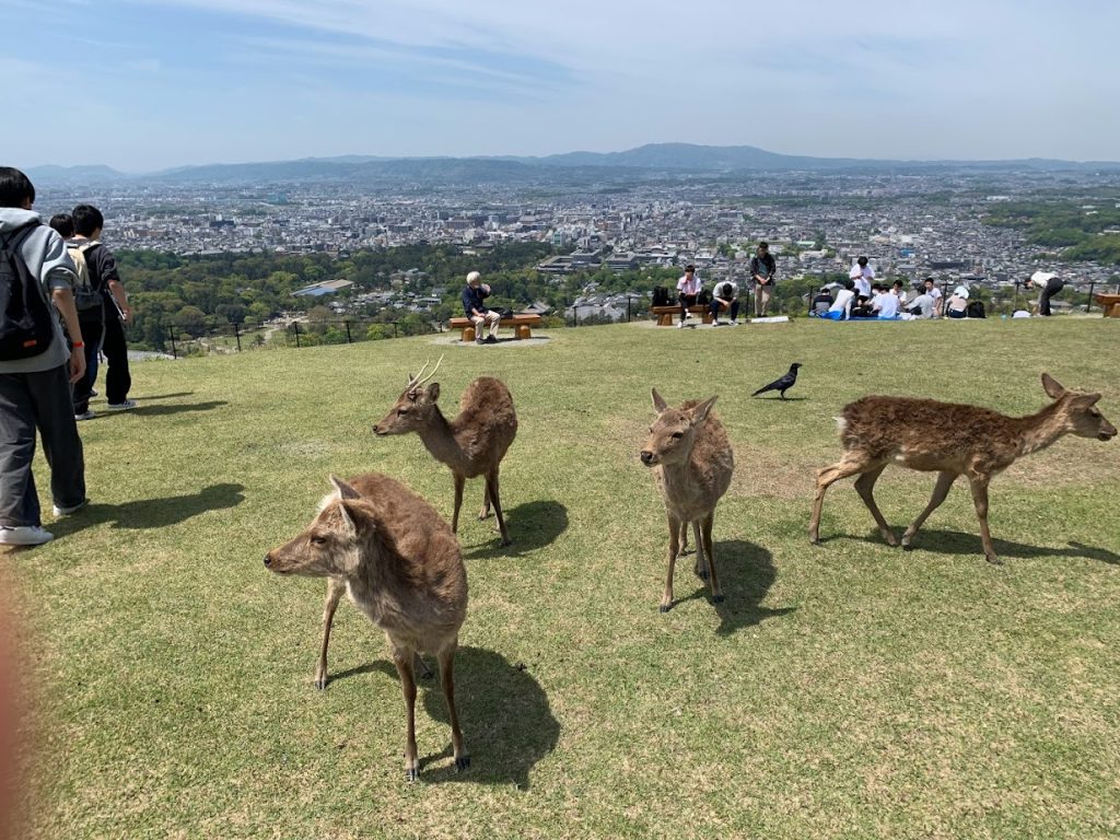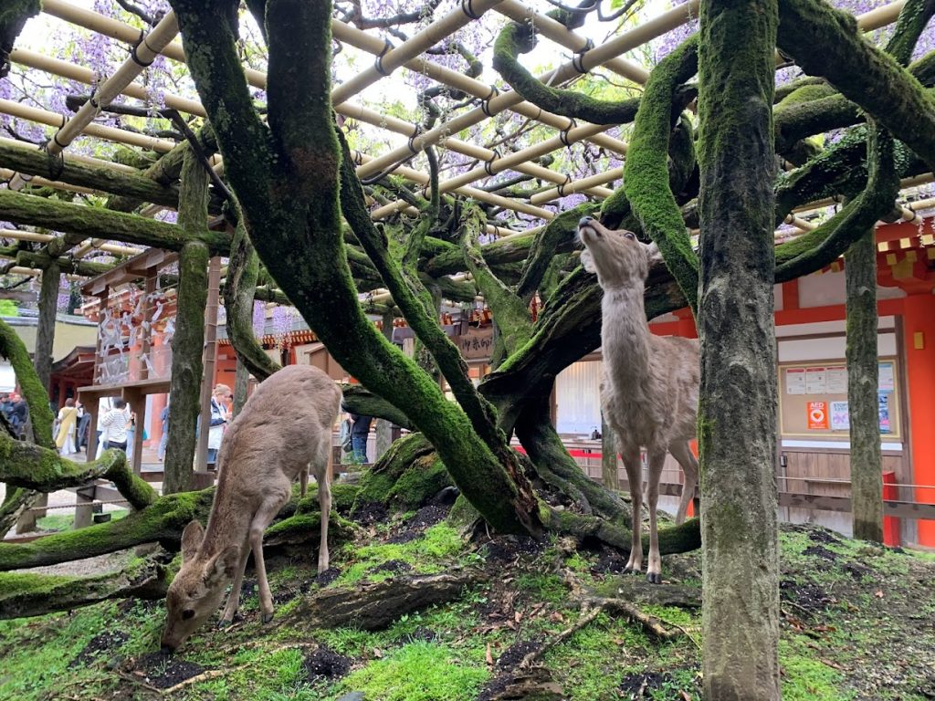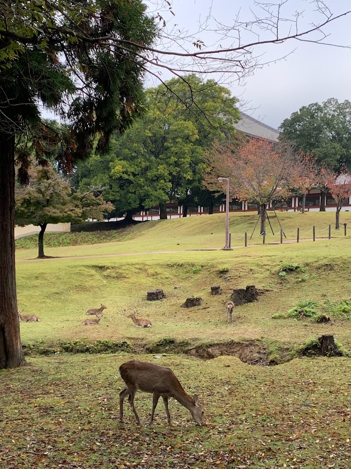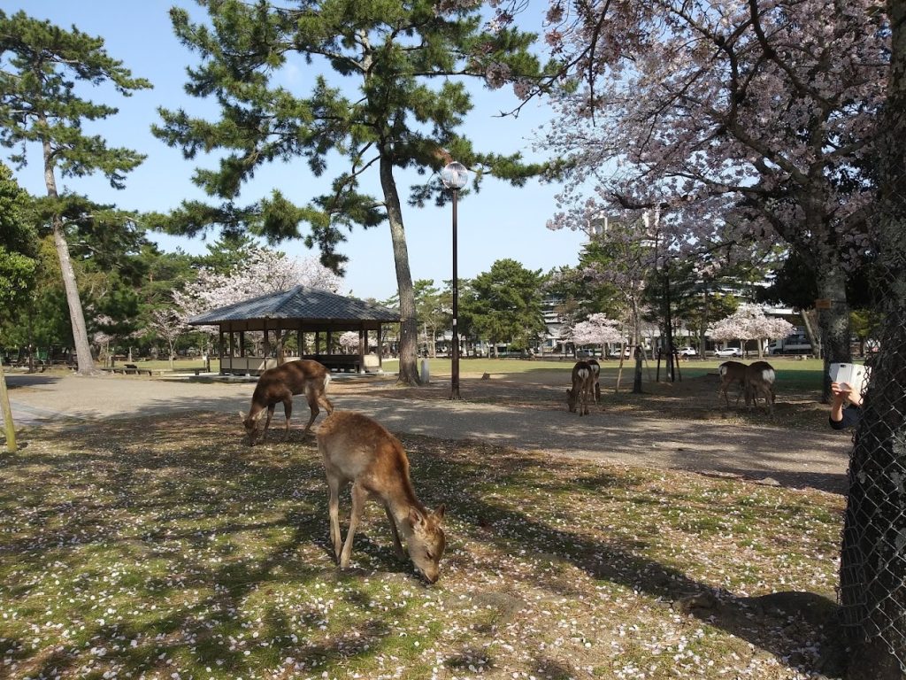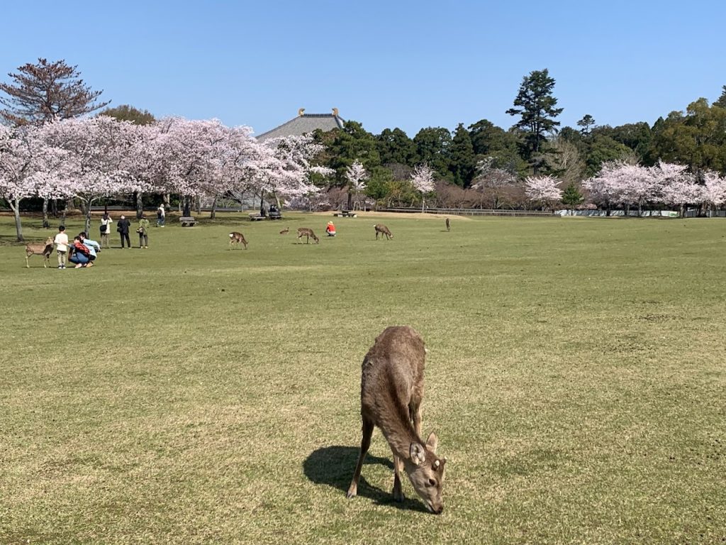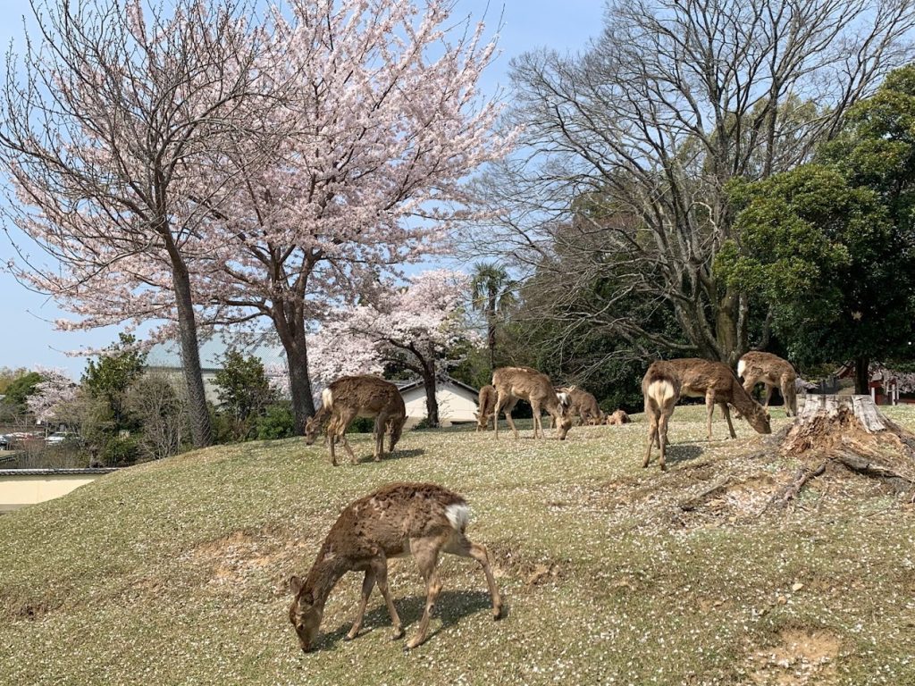大学の構内で、鹿が自然体で食事をしている風景は、やはり奈良ならではです。