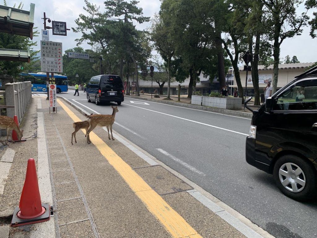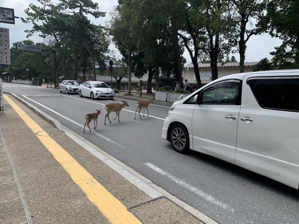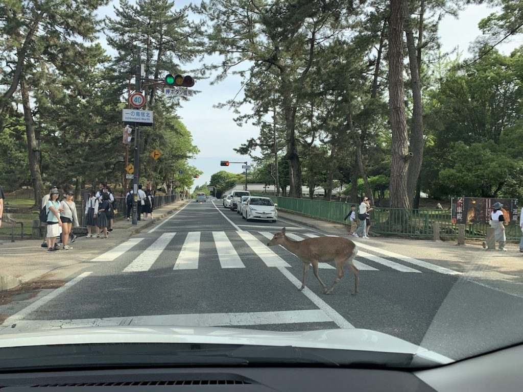 鹿が道路前で立ち止まっているため、車は止まっています。