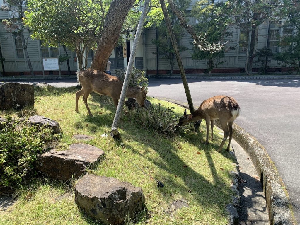 記念館の前の植え込みに鹿がのんびり食事をしています。