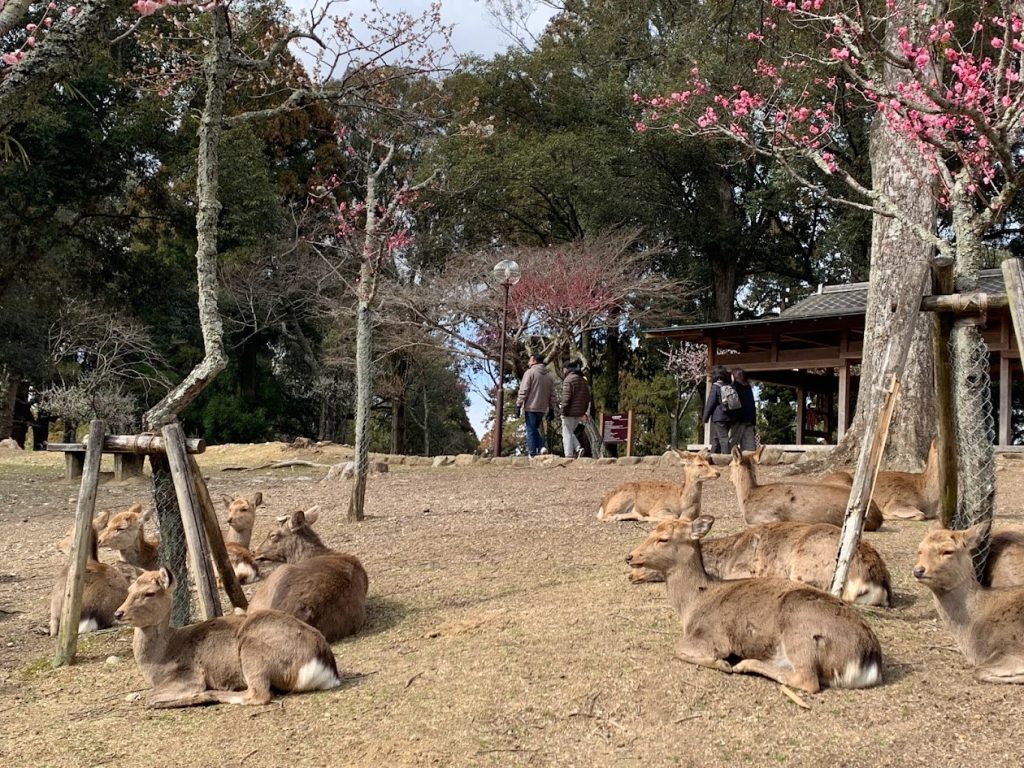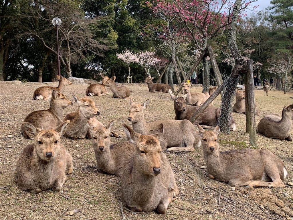 奈良公園の鹿は野生動物で、夜は森の木の下などにかたまって眠ります。