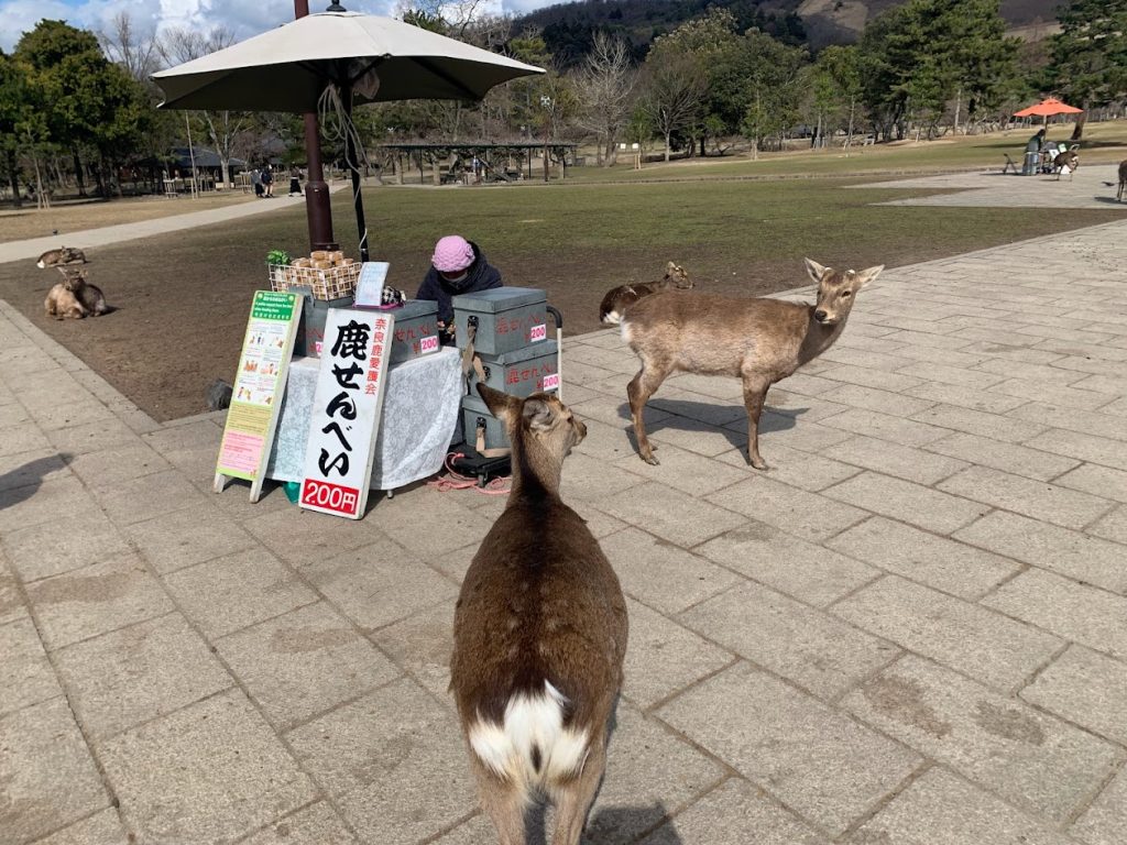 鹿せんべいを誰かが買ってくれるのを待っています。