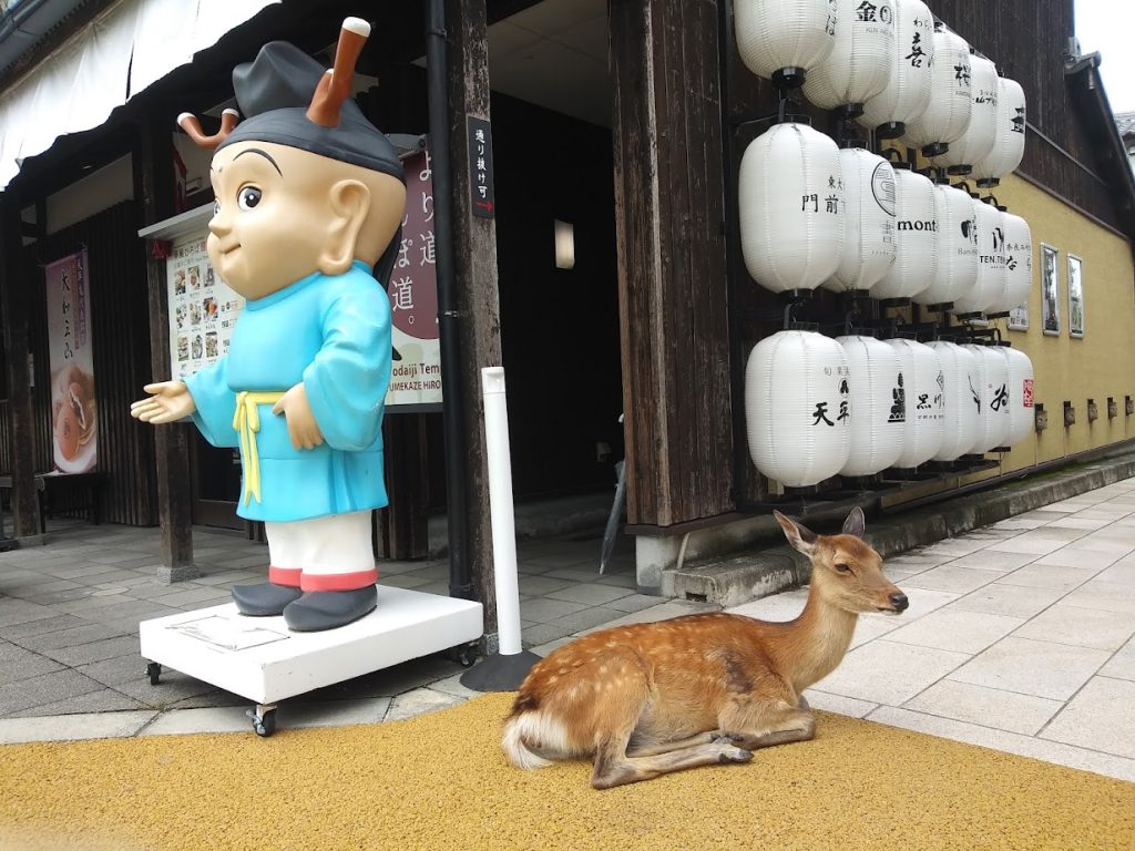 横の像は天平衣装を着た奈良県マスコットキャラクター「せんとくん」