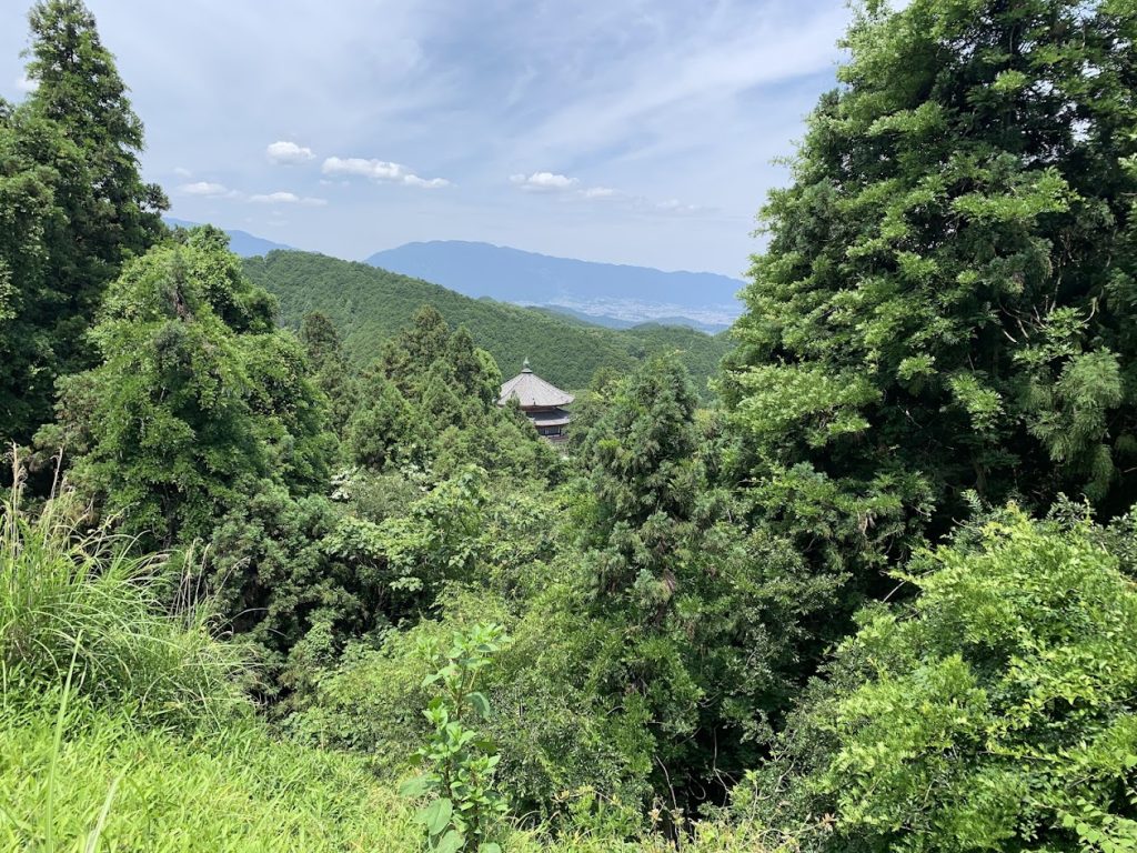 Tsubosaka-dera temple has come into view through the trees.
