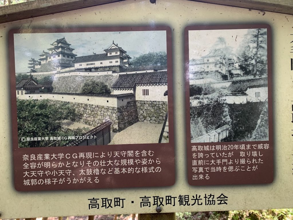 This information board at the castle displays a CG image from Nara Sangyo University, showing what the castle might have looked like during the Edo period.