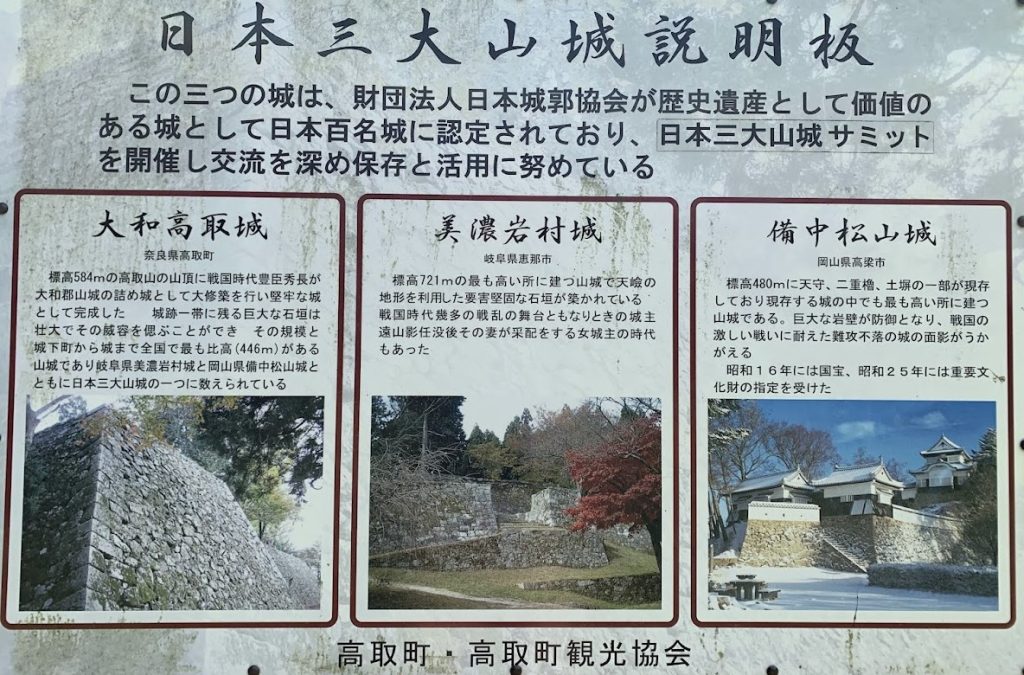 There was a signboard explaining the Three Great Mountain Castles of Japan: