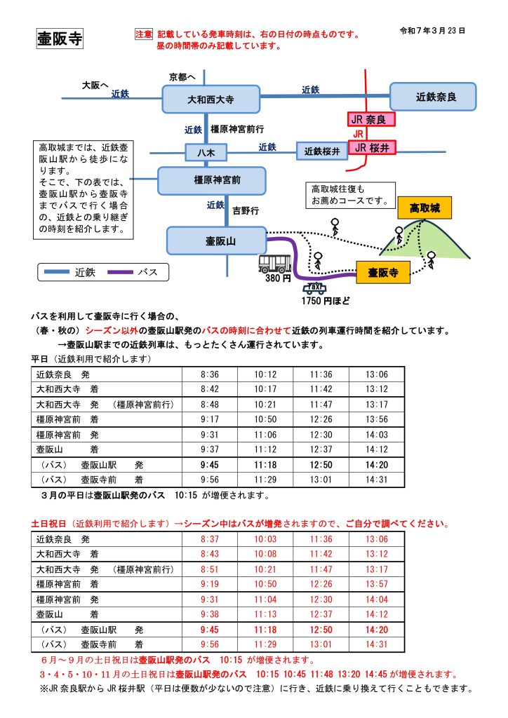 高取城・壷阪寺へのアクセス|奈良駅から近鉄壺阪山駅経由で 行き方(奈良駅から) 2025.09.09 高取城のページに戻る 注意下の文書に記載している発車時刻は、文書右上の日付の時点のものです。当日の発車時刻はぜひ、ご自分で確認ください。特に、便数の少ない交通機関は、十分にご注意ください。なお、発車時刻は昼の時間帯のみ記載しています。