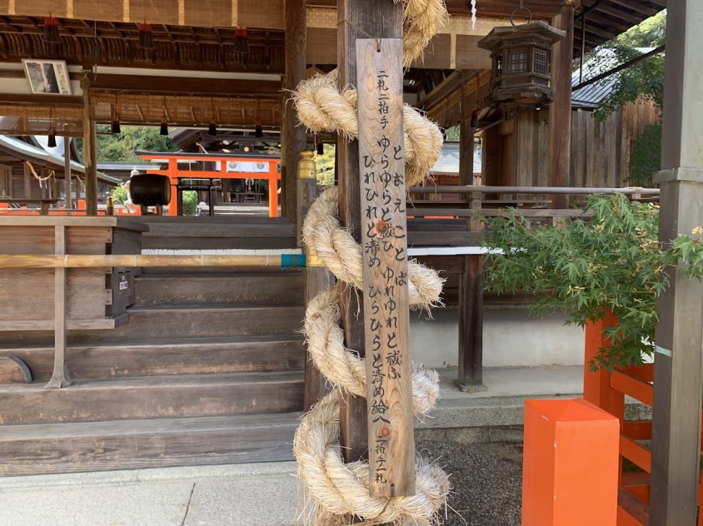 Tatsuta Taisha Shrine enshrines the deity of wind. The unusual shimenawa (sacred straw rope) at this worship hall represents a dragon, the guardian of the wind, coiling around it.