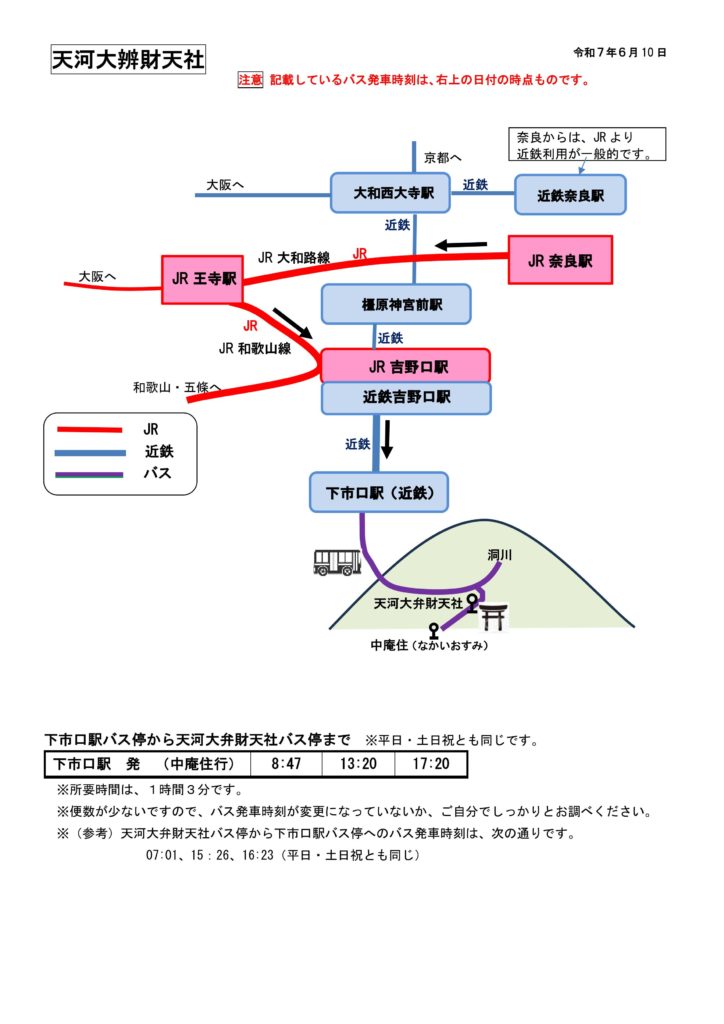 天河大辨財天社へのアクセス|奈良駅から近鉄下市口駅・バス乗換 行き方(奈良駅から) 2025.09.09 注意下の文書に記載しているバス発車時刻は、文書右上の日付の時点のものです。バスの便数が非常に少ないため、当日の発車時刻はぜひ、ご自分で確認ください。下市口駅(近鉄)までの列車の時刻も、ご自分で確認ください。近鉄奈良駅から近鉄利用が一般的です。 天河大辨財天社のページに戻る