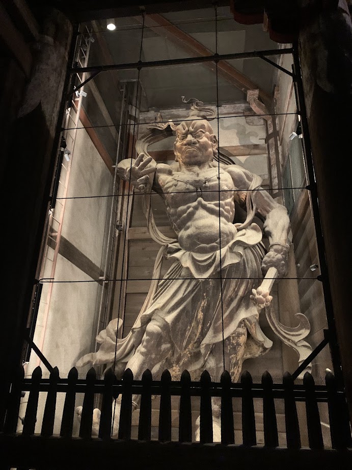 この日は、金剛力士像も照明され、しっかりと細部まで見ることができました。運慶・快慶らによって造られた金剛力士像(阿形・吽形)の像高は約8.4メートルで、わずか69日間で造られたという驚異のスピードと技術が話題です。この二体の仁王像は、東大寺を守る守護神として、訪れる人々を静かに見守っています。